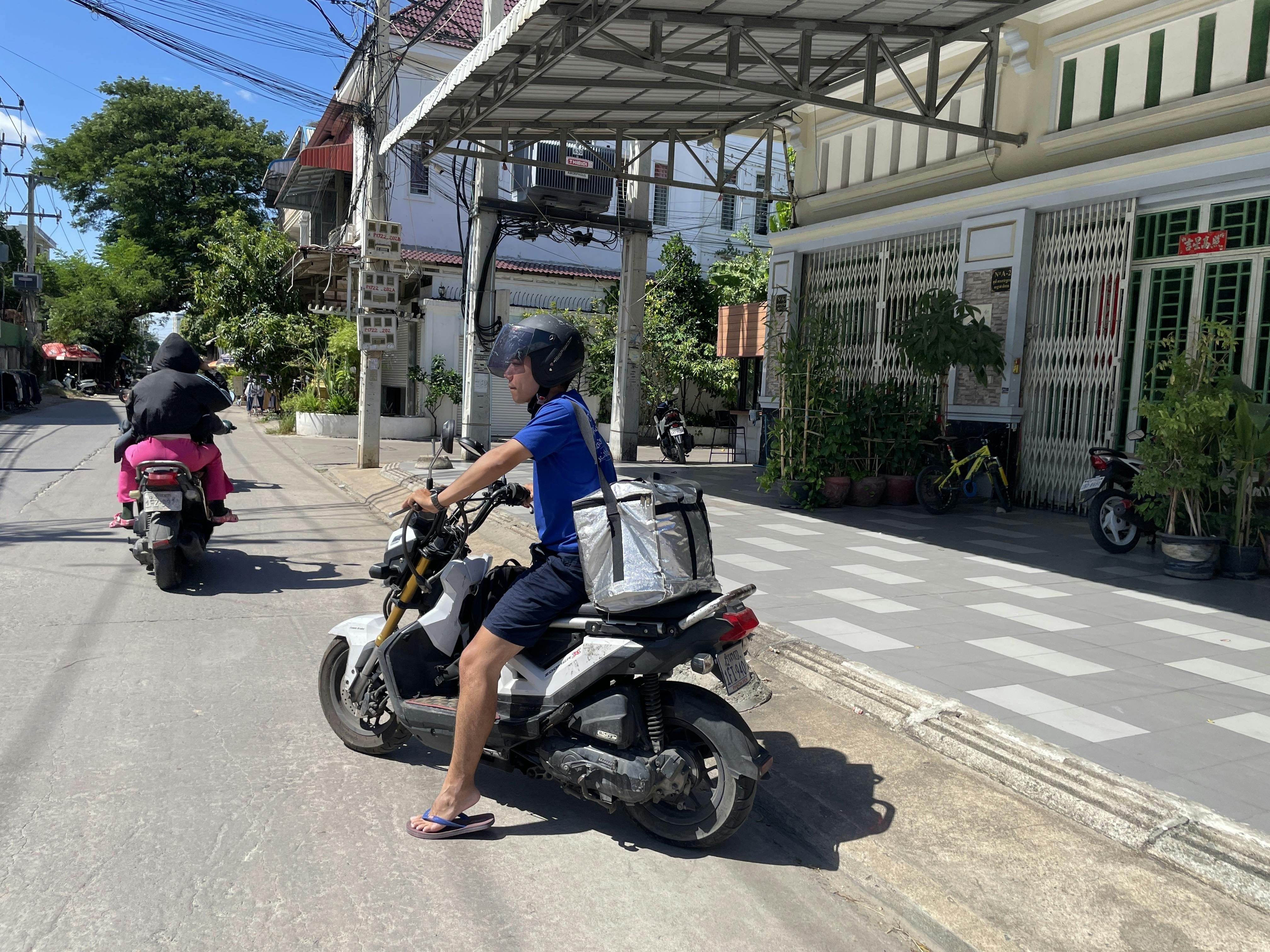 朝はスタッフと一緒に果物をカットし、午後は商談や販売に出かけます。保冷バッグは年季が入り、バイク移動で日焼けが進み、最近はカンボジア人に間違われるようになってきました。