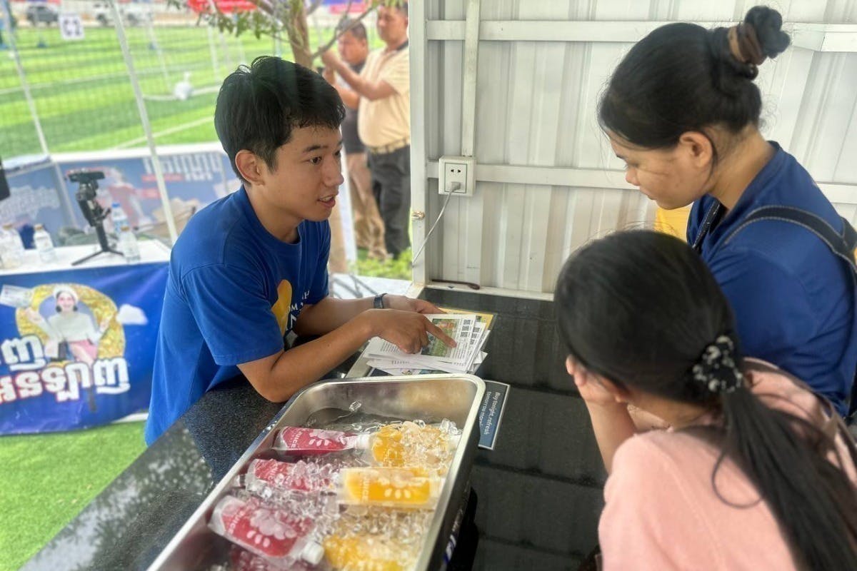 朝はスタッフと一緒に果物をカットし、午後は商談や販売に出かけます。保冷バッグは年季が入り、バイク移動で日焼けが進み、最近はカンボジア人に間違われるようになってきました。