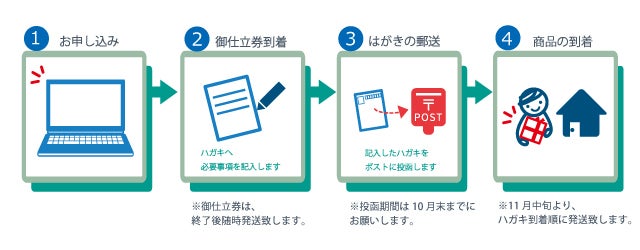 皆さまへは、当社へハガキが到着致しました順番で、11月中旬から、商品を随時発送させていただきます。