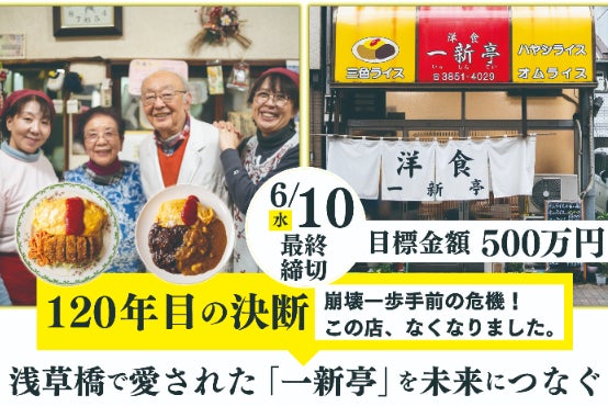 浅草橋で三世代にわたり愛されてきた老舗食堂「洋食 一新亭」。2026年1月、老朽化により建物を解体、この場所を守り続けることが難しくなっています。町の思い出の食堂を次世代へつなぐため、私たちは建て替えに挑戦します。