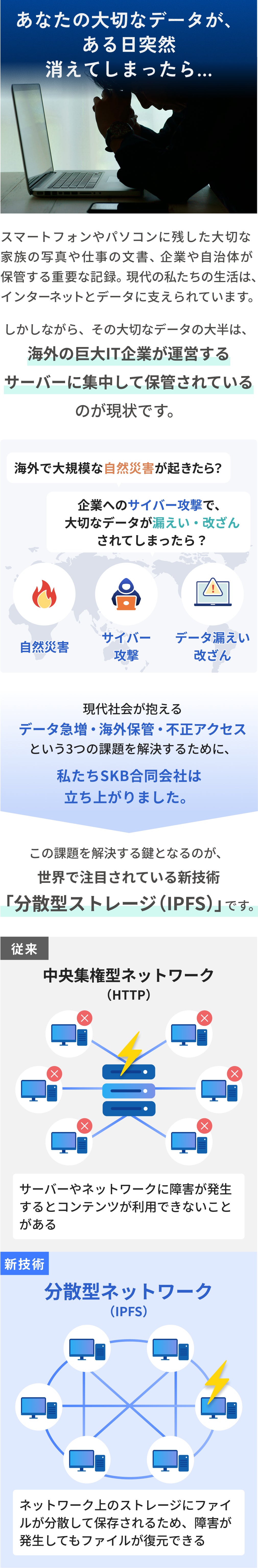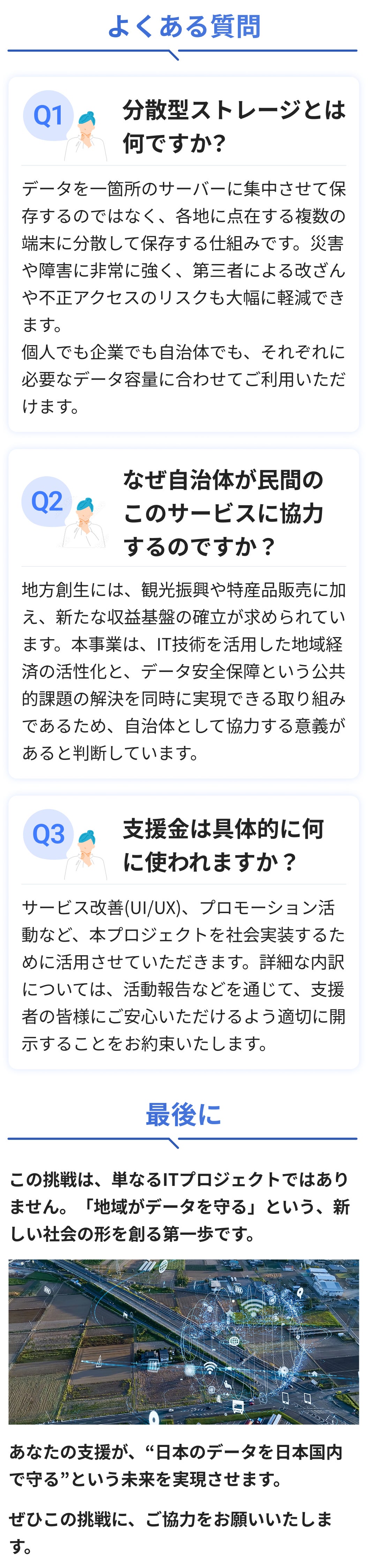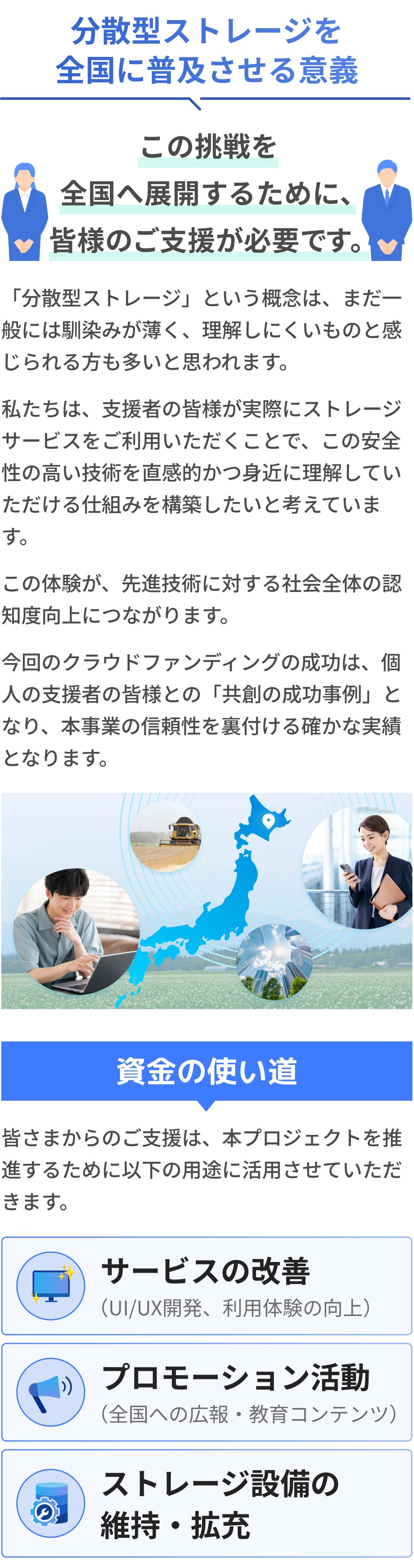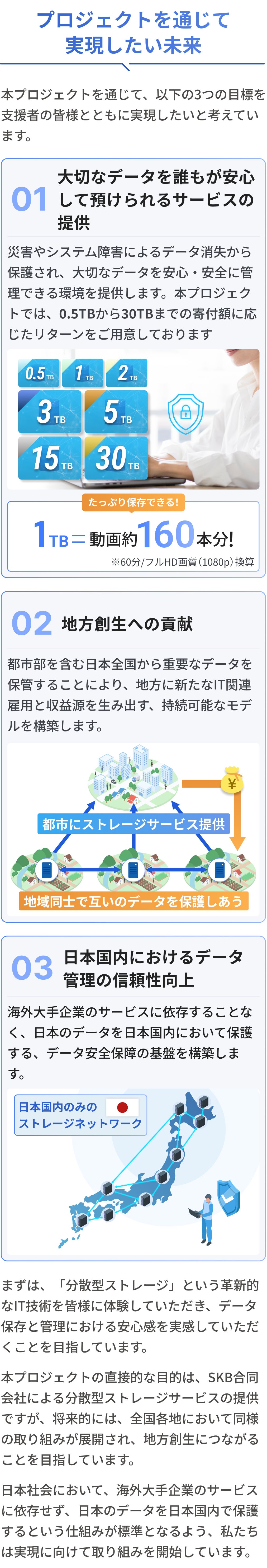 2026/04/15 14:29いつも温かいご支援・応援をいただき、誠にありがとうございます。今回は改めて、本プロジェクトのリターン(サラストレージ)についてご紹介させていただきます。サラストレージは、大切なデータを100%日本国内で分散保存する、官民連携によって実現する新しいデータ保管の仕組みです。従来のクラウドサービスとは異なり、以下の特徴があります。【なぜ、国産型分散ストレージが必要なのか?】現在、世界のストレージ市場は一部の海外企業(Microsoft・Google・Apple・Amazon・Alibaba.com)に大きく依存しており、日本のデータも多くが国外に保存されているのが現状です。日本のデータも海外に保存されていることが問題になっていて、個人、法人問わず、海外の大手クラウドサービスを使っているが、ある日突然、会社の機密データにアクセスできなくなる可能性が0ではないその中で、「日本のデータは日本で守る」という考えのもと、私たち(Social Knowledge Bank合同会社と北海道更別村)は、本プロジェクトは立ち上げました。今後ますます増え続けるデータに対して、安心・安全かつ持続可能な保存環境を提供することが、私たちの目指す未来です。特に、大容量のデータを持つ個人・法人におすすめです・動画や写真など大容量データを扱う個人の方・クリエイターや事業者の方・重要データを国内で管理したい企業・自治体にとって、有効な選択肢になると考えています。リターンでは、0.5TB〜30TBまでの幅広い容量プランをご用意しております。この取り組みを、より多くの方に知っていただくことが何より重要です。ぜひ引き続きご支援、そしてシェアでの応援をいただけますと幸いです。今後ともどうぞよろしくお願いいたします。☆リターン一覧はこちらhttps://camp-fire.jp/projects/911054/backers/new もっと見る
