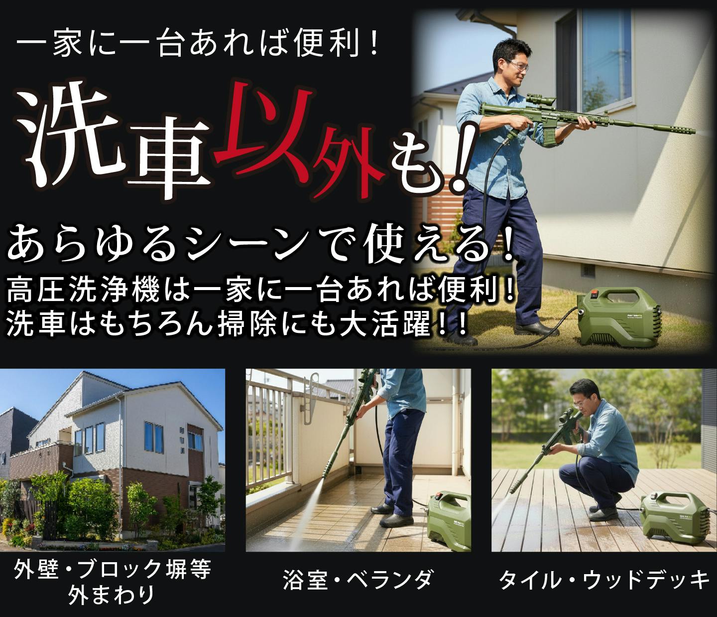 【活用シーン】洗車・外壁・玄関・ベランダ・農機具などの洗浄まで万能!