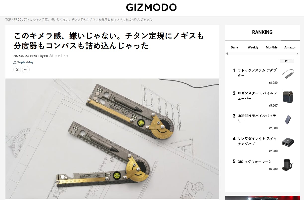 2026/02/25 21:00皆様、こんばんは!Bright DIYチームです。2月23日、GIZMODOで「Tiruler」を紹介して頂きました。話題:このキメラ感、嫌いじゃない。チタン定規にノギスも分度器もコンパスも詰め込んじゃった興味がある方、是非下記のリンクからアクセスしてみてください。https://www.gizmodo.jp/2026/02/machi-ya-tiruler-start-911112.html【レビューの一部抜粋】〈定規・ノギス・分度器・ローラー測定・コンパスといった機能をチタン合金の折りたたみボディに集約。0.1mm単位の精密測定にも対応しつつ、ペンシルやカッターガイドまで1本に収まっています。詳しく見ていきましょう。測るツールとしてノギスも付属。本尺とバーニヤ目盛を合わせることで計測単位は0.1mm。ミリ未満の寸法も正確に読み取れます。正確な寸法計測が必要な際にも役立ちますよ。ローラーメジャーは曲面や不規則な形状を正確にトレース可能。内部にバネが組み込まれており、1回転(100mm)ごとにカチッという音が鳴るため、回転数も手軽にカウントできるのも便利なポイント。ちょっと蛇足的ですが栓抜きとしても使えますよ。有料オプションにはなりますがレザーケースやペンキャップなど、用途や利用シーンを広げてくれるアイテムも充実。〉ご興味のある方はこの機会をお見逃しなく!https://camp-fire.jp/projects/911112/view3月31日まで販売期間は続きますので、ぜひSNSでのシェアや身近な方にもおすすめしていただけると嬉しく思います。#tiruler #brightdiyどうぞよろしくお願い致します。BRIGHTチーム もっと見る