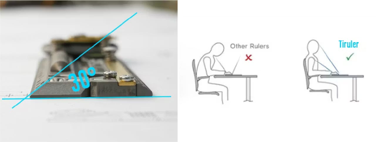 Tirulerの大きな特長の一つが、定規本体に施された30°の傾斜設計です。この角度によって、目盛りを自然な姿勢で確認することができ、首を無理に曲げる必要がありません。長時間の使用でも首や肩にかかる負担を軽減し、作業の集中力を保つことができます。見た目はシンプルながらも、使う人の体への配慮が感じられるプロダクトです。まさに、エルゴノミクスを意識した「道具らしい道具」と言えるでしょう。
