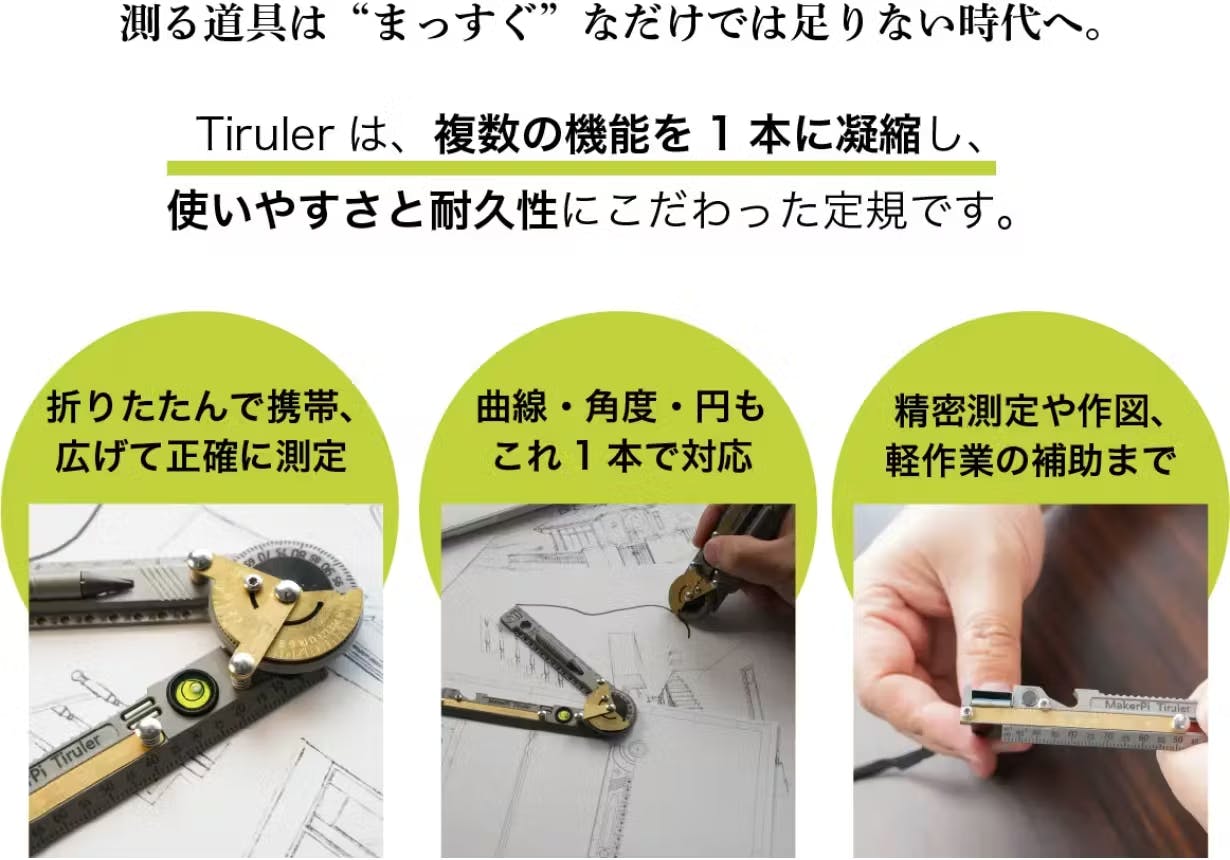 〈Tirulerは、「測る・描く・切る・収納」を1本でこなす多機能ツール定規です。全長200mmの定規として使え、折りたたむとマグネットで固定できるコンパクト設計。チタン合金製で高い耐久性を備え、紙のカットにも対応します。自然な視線角度に配慮したデザインで、作業時の負担軽減にも配慮されています。