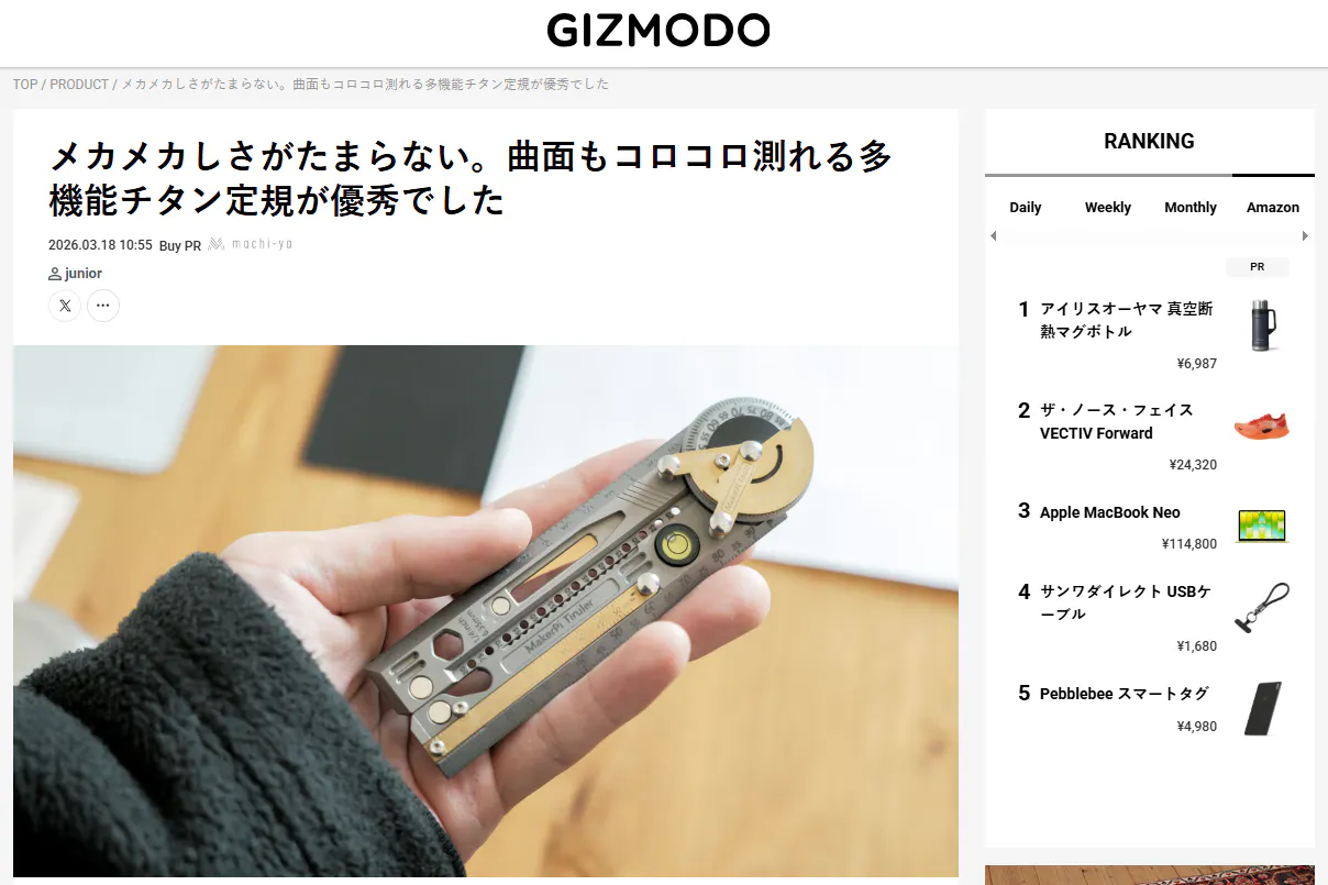 2026/03/22 21:00皆様、こんばんは!Bright DIYチームです。3月18日、GIZMODOで「Tiruler」を紹介して頂きました。話題:メカメカしさがたまらない。曲面もコロコロ測れる多機能チタン定規が優秀でした興味がある方、是非下記のリンクからアクセスしてみてください。https://www.gizmodo.jp/2026/03/machi-ya-tiruler-review-911112.html【レビューの一部抜粋】〈実際の製品を試させてもらいデザインや質感も優秀だと感じたので、文具好きの皆さんはぜひ参考にしてみてください。名前にあるとおりTi(チタン)製のため、重そうに見えて実際は約60gと軽量なのがポイント。スチームパンクを感じるデザインも筆者好みでした。内蔵のチタン製マグネットペンシルも意外と便利。書き心地はサイズなりですが、思い立った時にサッと取り出して作図やメモに取り掛かれます。支点部分には分度器が備わっているので、角度が重要な作図にもしっかり使えますよ。平面の曲線もスムーズに計測。1回転(100mm)ごとにカチッ、カチッと鳴るので長い対象でもカウントしやすいですよ。書く・測るだけではなく簡易的なビットレンチや缶オープナーとしても使える多機能で、3DプリンターやDIYなどモノづくり趣味には1本あると便利なツールでした。〉ご興味のある方はこの機会をお見逃しなく!https://camp-fire.jp/projects/911112/view3月31日まで販売期間は続きますので、ぜひSNSでのシェアや身近な方にもおすすめしていただけると嬉しく思います。#tiruler #brightdiyどうぞよろしくお願い致します。BRIGHTチーム もっと見る