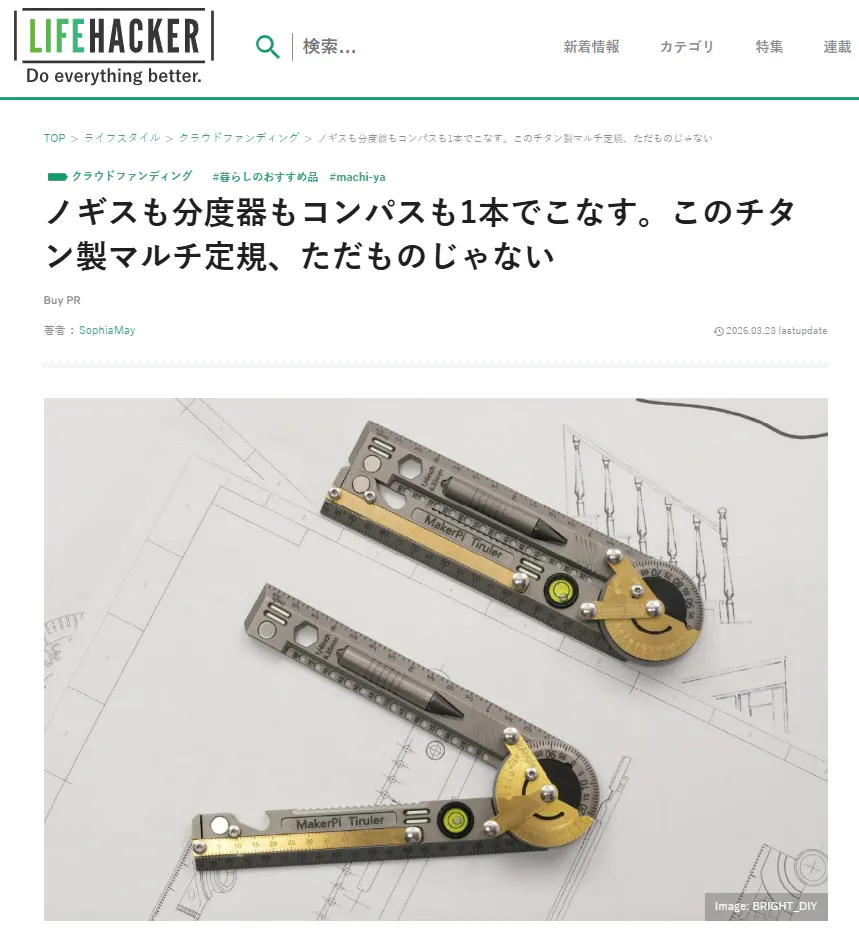 2026/03/25 21:00皆様、こんばんは!Bright DIYチームです。3月23日、Lifehackerで「Tiruler」を紹介して頂きました。話題:ノギスも分度器もコンパスも1本でこなす。このチタン製マルチ定規、ただものじゃない興味がある方、是非下記のリンクからアクセスしてみてください。https://www.lifehacker.jp/article/machi-ya-tiruler-end-911112/【レビューの一部抜粋】〈書く・測るが1つのツールに集約まずは定番機能の定規。インチとセンチを1本で測れ、畳んだ状態だとコンパクトなのが便利。ローラーメジャーは曲面や不規則な形状を正確にトレース可能。1回転(100mm)ごとにカチッという音が鳴るため、カウントも容易だそうですよ。しても使えますよ。冒頭の繰り返しになりますが本体はチタン合金製で折りたたみ時の全長は約100mm。ペンケースでも邪魔になりません。軽さと耐久性を兼ね備えているのでタフに使えるのもポイントです。有料オプションにはなりますがレザーケースやペンキャップなど、用途や利用シーンを広げてくれるアイテムも充実。〉ご興味のある方はこの機会をお見逃しなく!https://camp-fire.jp/projects/911112/view3月31日まで販売期間は続きますので、ぜひSNSでのシェアや身近な方にもおすすめしていただけると嬉しく思います。#tiruler #brightdiyどうぞよろしくお願い致します。BRIGHTチーム もっと見る