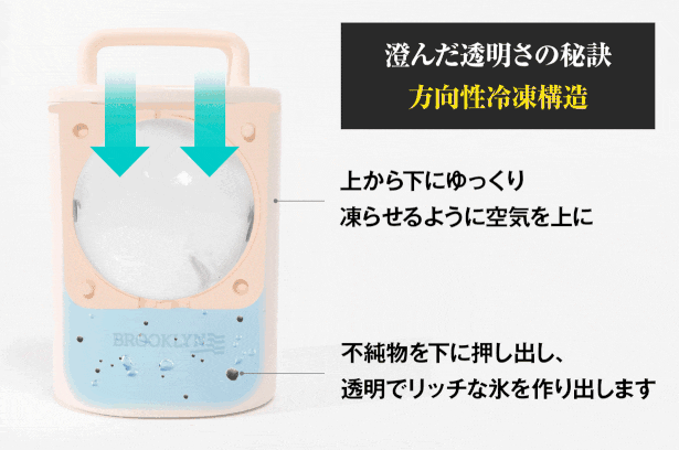 「BROOKLYN REAL ICE」をはじめとした透明氷メーカーの仕組みがこちら。水が凍る部分やスピードが調整されているので、不純物や空気が逃げやすいのがポイントです。'