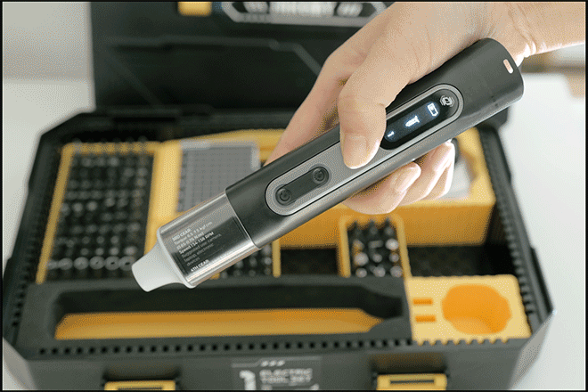 さっそく主役の電動ドライバーをテスト。ペン型の中では大きいタイプなので手のひら全体で握る感じですね。操作は直感的で締める・緩めるもすぐ慣れました。