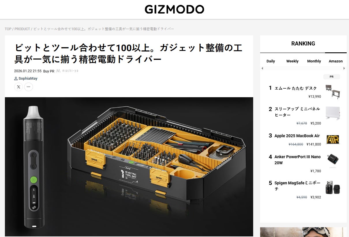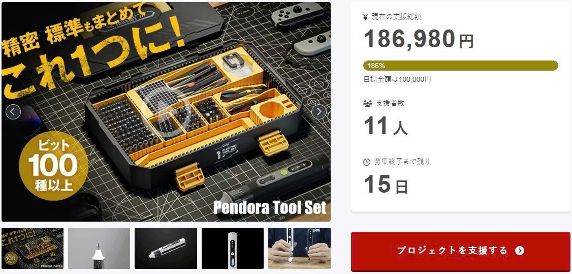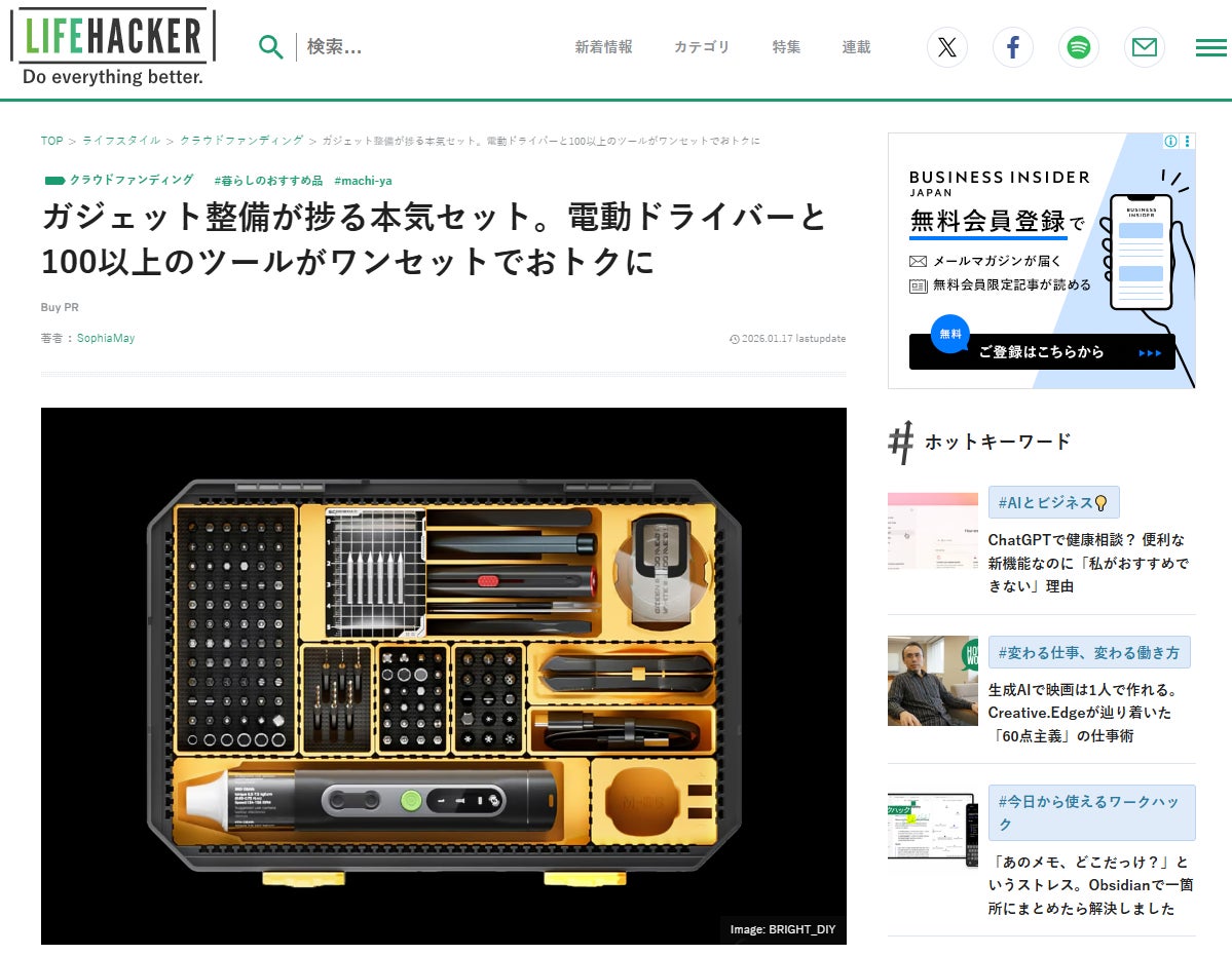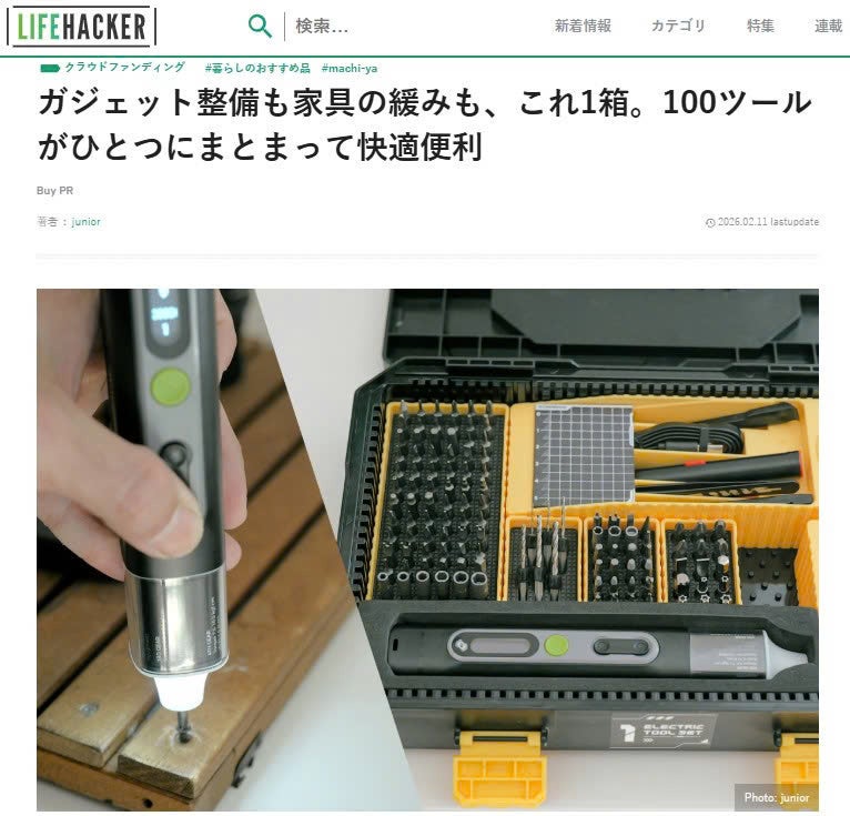 皆様、こんばんは!Brightチームです。2月11日、Lifehackerで「PENDORA TOOL SET」を紹介して頂きました。話題:ガジェット整備も家具の緩みも、これ1箱。100ツールがひとつにまとまって快適便利興味がある方、是非下記のリンクからアクセスしてみてください。https://www.lifehacker.jp/article/machi-ya-pendoratoolset-review-911115/【レビューの一部抜粋】〈ぎっしり詰まってもケースはスリムビットを含めたツール総数は100以上。これだけあれば家にあるネジのほとんどは対応できるでしょう。さっそく主役の電動ドライバーをテスト。ペン型の中では大きいタイプなので手のひら全体で握る感じですね。操作は直感的で締める・緩めるもすぐ慣れました。先端のLEDライトもやっぱりあると便利。自作PCなど手元が暗くなりがちなシーンで助かりました。ピンセットなども便利ですが、筆者的に嬉しかったのが写真のイヤホンクリーニングツール。気がつくと耳垢などで汚れているものの、わざわざ単体で専用ツールを買うほどでもなかったので助かりました。〉ご興味のある方はこの機会をお見逃しなく!https://camp-fire.jp/projects/911115/view2月28日まで販売期間は続きますので、ぜひSNSでのシェアや身近な方にもおすすめしていただけると嬉しく思います。#pendoratoolset #brightdiyどうぞよろしくお願い致します。BRIGHTチーム