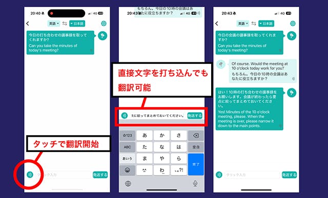 話すだけでなく、直接文字を打ち込んでの翻訳も可能。