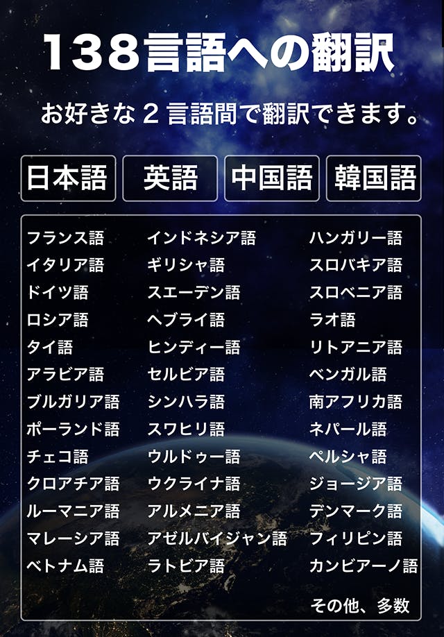 英語・中国語・日本語・韓国語はもちろん、ヒンディー語やアラビア語など幅広くカバー。