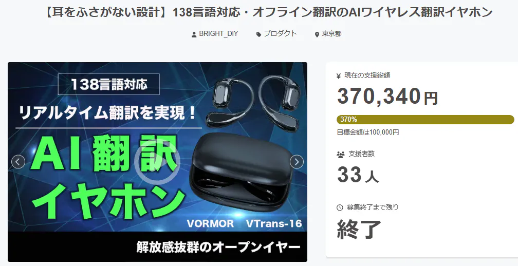 2026/03/16 17:49サポーター様、【耳をふさがない設計】138言語対応・オフライン翻訳のAIワイヤレス翻訳イヤホンにご興味をお持ちいただきありがとうございます。プロジェクト開始から51日目で33人ものご支援者の方々より支援頂き、無事プロジェクト終了を迎えることが出来ました。早速皆様のリターンを2026年06月末にお届けできるよう準備を始めております!皆様にご満足いただけるリターンをお届けできるよう、全力で取り組んで参りますので引き続き、「【耳をふさがない設計】138言語対応・オフライン翻訳のAIワイヤレス翻訳イヤホン」をよろしくお願い致します。BRIGHTチーム もっと見る