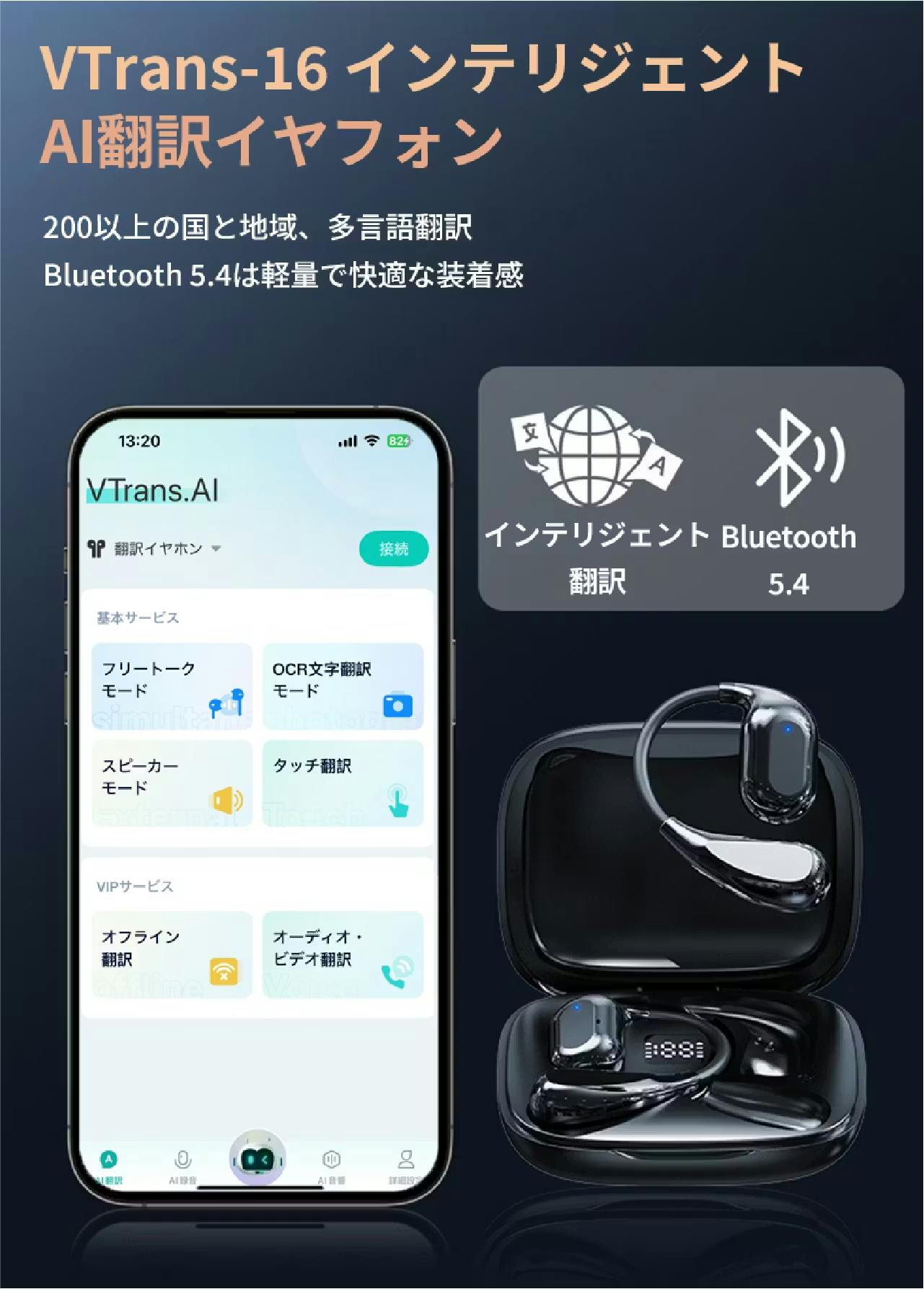 言葉の違いは、時に人と人との距離を広げてしまいます。VTrans-16は、その距離を一瞬で縮めるために生まれた次世代の翻訳イヤホンです。最新AIを搭載し、リアルタイム音声翻訳をはじめ、写真翻訳やタッチ翻訳など多彩な機能を一台に集約。日常会話からフォーマルな場面まで、あらゆるコミュニケーションをスムーズにサポートします。