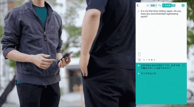 相手が話した内容はアプリでリアルタイムに文字化・翻訳され、イヤホンからは翻訳された音声が流れる仕組み。