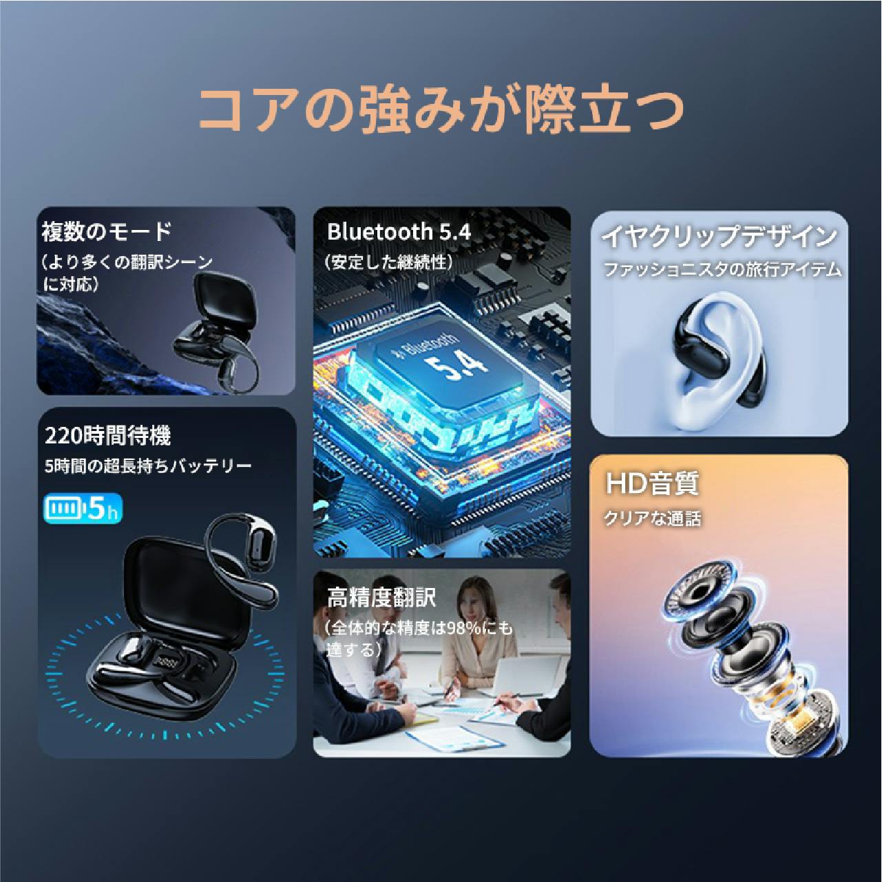 複数の翻訳モードを搭載し、旅行からビジネス、学習まで使い分けできる実用的な 翻訳イヤホンです。