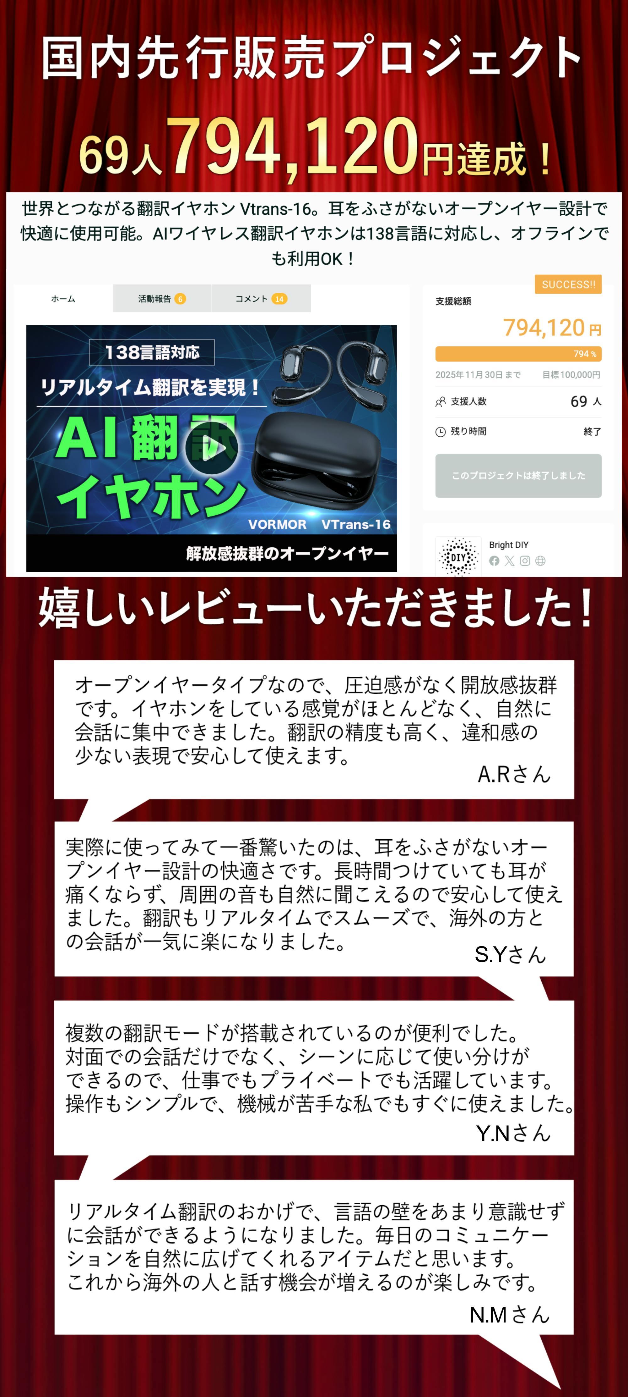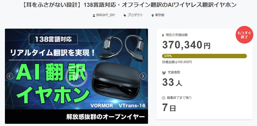 2026/03/08 12:00ご支援者様、【耳をふさがない設計】138言語対応・オフライン翻訳のAIワイヤレス翻訳イヤホンにご興味をお持ちいただきありがとうございます。お陰様で、開始から支援総額30万円達成することができました!終了までわずか7日となります。プロジェクト終了後、「【耳をふさがない設計】138言語対応・オフライン翻訳のAIワイヤレス翻訳イヤホン」 をCamfire 特別価格で入手することはできなくなりますので、ご支援 がまだの方、追加支援 をご検討の方はお急ぎくださいますようお願い申し上げます。ご興味のある方、ぜひ支援お願い致します。https://camp-fire.jp/projects/911118/viewBright DIYチームは、当プロジェクトをもっと多くの方に知っていただきたいと考えております。よかったら、SNSでのシェア・拡散をお願い致します。#vtrans16 #brightdiyどうぞよろしくお願い致します。Brightチーム もっと見る