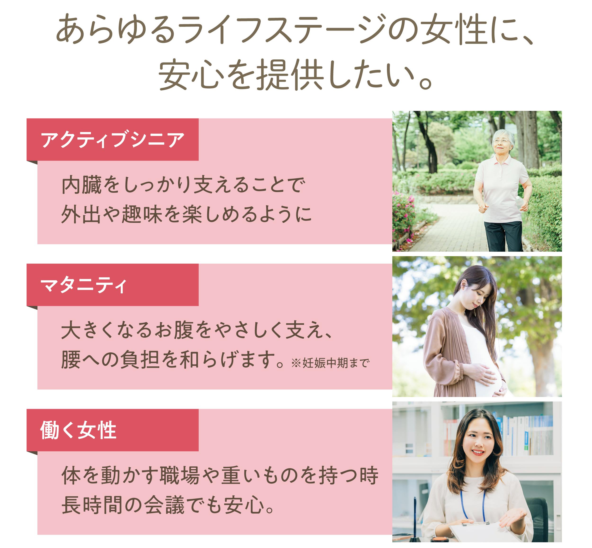 デリケアベルト フェミーナは、骨盤底筋や内臓をやさしく支えることで、日常生活の不安を軽減します。