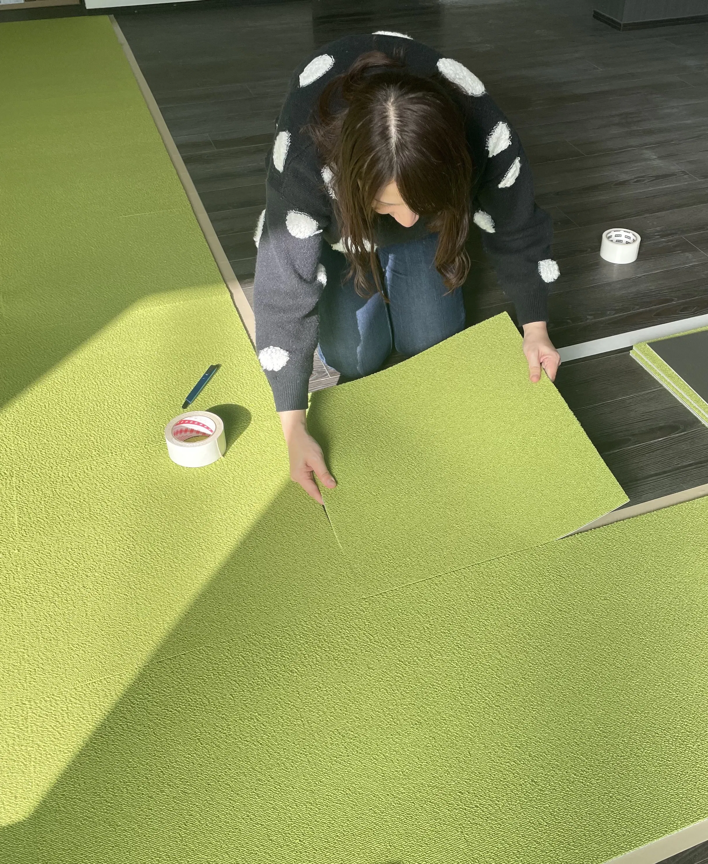 リフォーム代節約のため、私もタイルカーペット貼りに参加しました。養生テープを貼り、カーペット用両面テープを貼り、タイルカーペットを敷き詰めました。