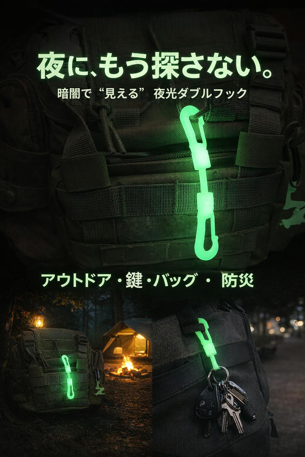 リュックに掛けた鍵やライトが、ぼんやりと光り、迷わず手に取れる安心感。