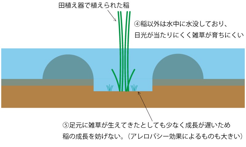 1と同じ理由から除草剤をしばらく使用せずに済み、後に雑草が生えてきても稲が優位に成長するため、