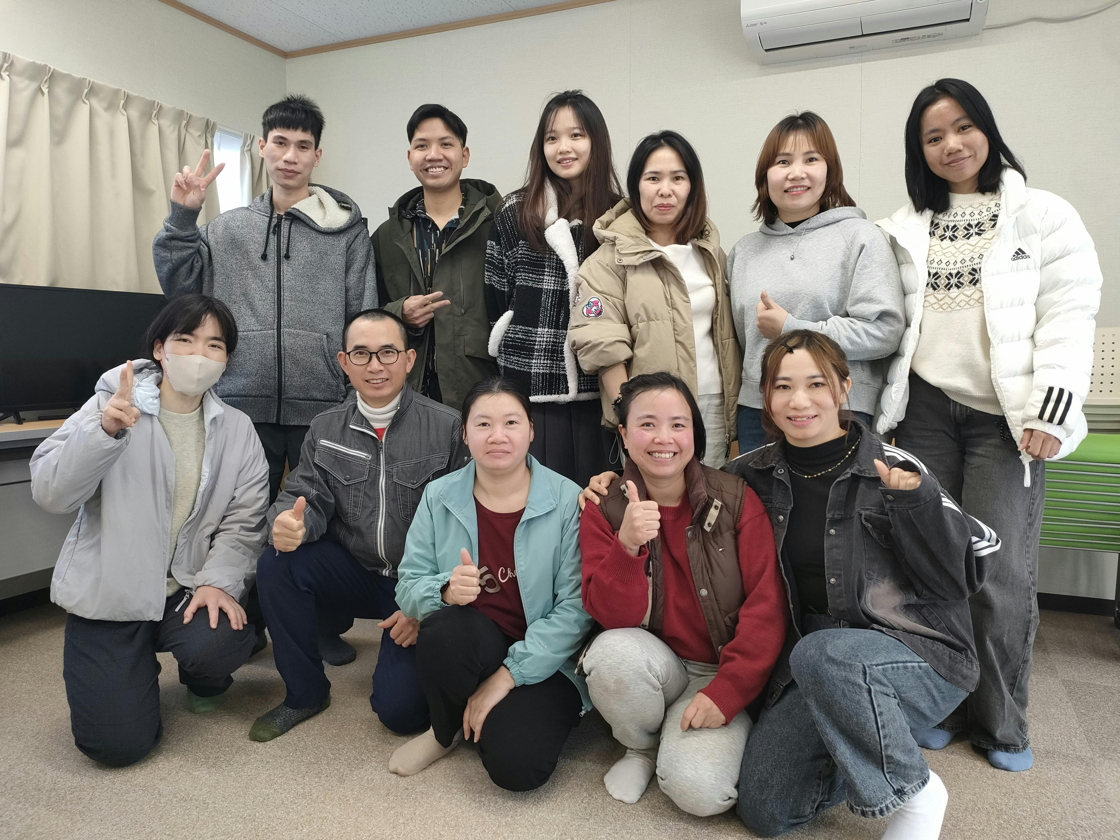 この日は、ベトナム、カンボジア、インドネシアを中心に、10人の技能実習生など外国人住民が参加してくれました。この日は、ベトナム人たちが「バインクオン」と呼ばれる、米粉を使った春巻きをつくってくれました。また、当日が誕生日のベトナム人がみんなでお祝いをしました!