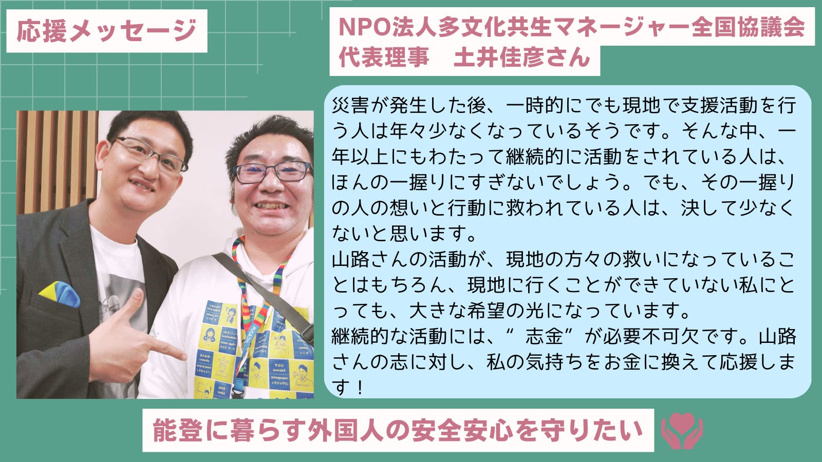 そのメンバーでつくるNPO法人多文化共生マネージャー全国協議会の土井佳彦代表理事から、クラウドファンディングへ応援メッセージをいただきました!