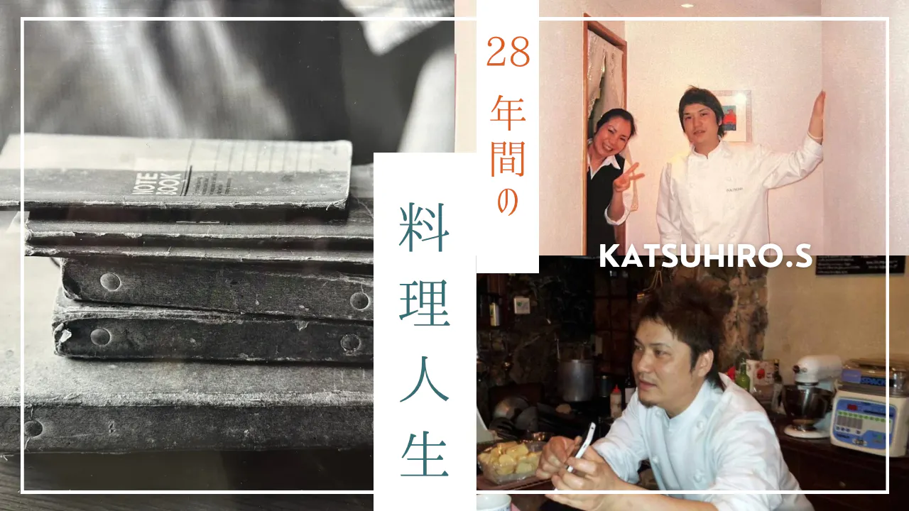 それでも料理から逃げずに耐え、料理に誠心誠意向き合ってきた時間が、すべてここに詰まっています。そして右の写真は、まだ何者でもなかった頃の自分。料理の世界に飛び込み、必死で腕を磨いていた若い頃の一枚です。