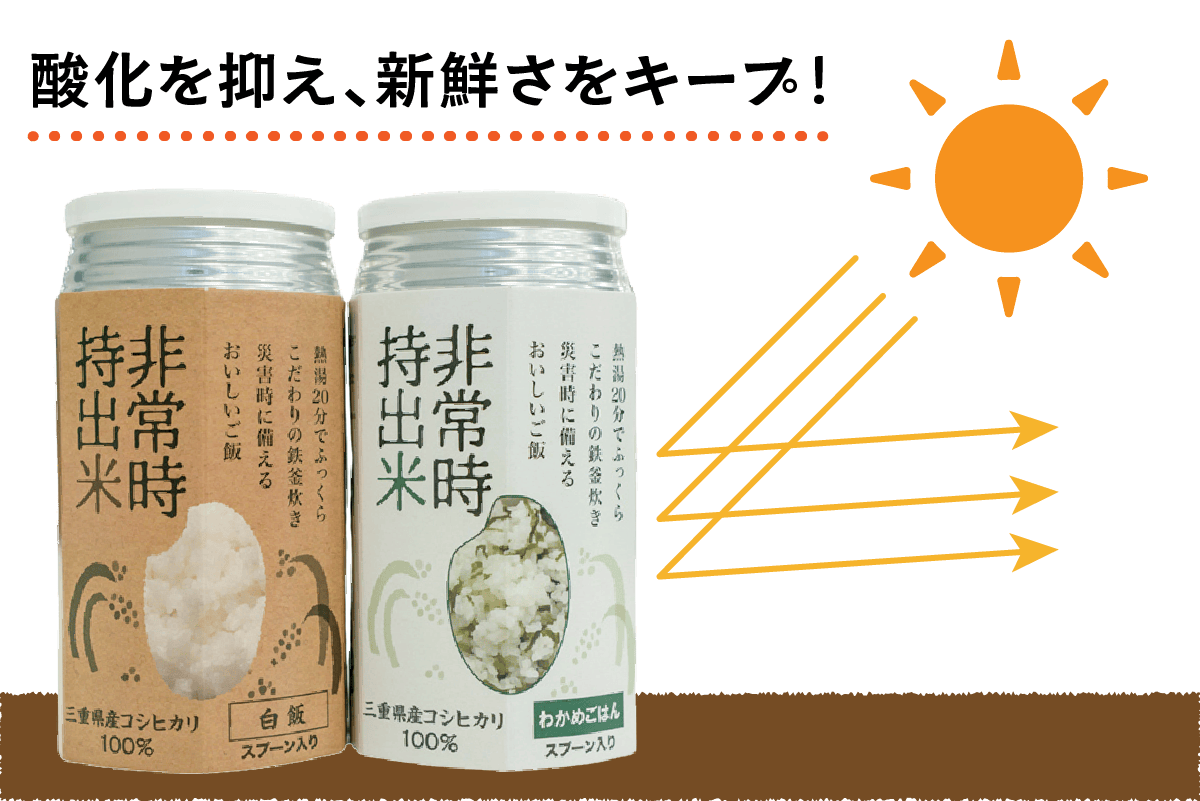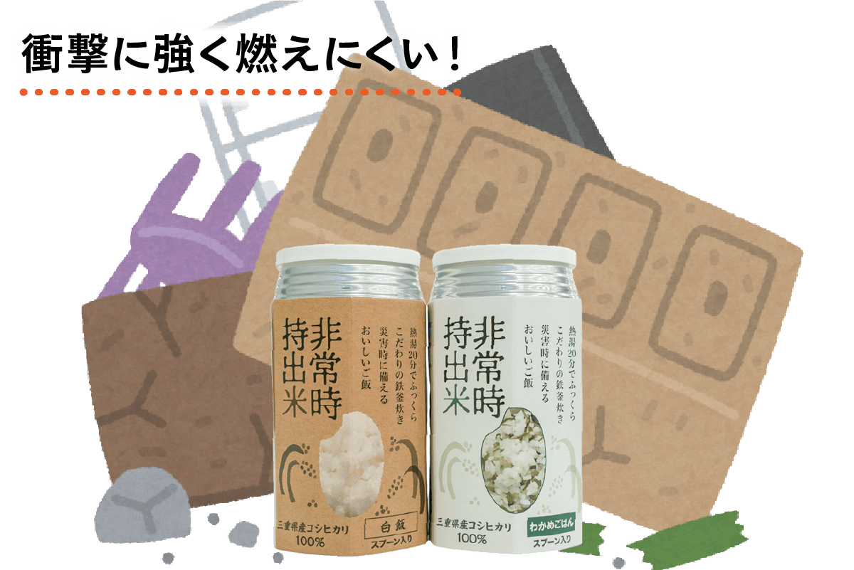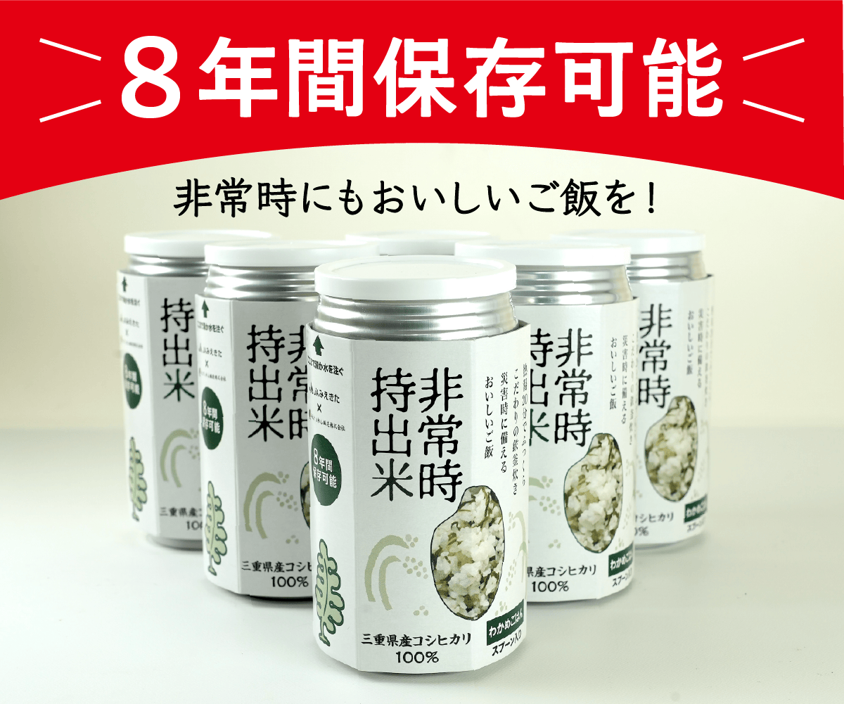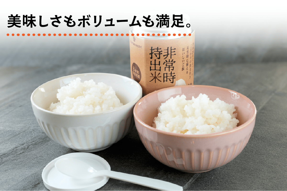 私たちは「非常時にもおいしいごはん」を目指し、試行錯誤を経て画期的な非常食「非常時持出米」を開発しました。保存性の高いアルミ缶入りで、窒素充填方式により8年間もの長期保存が可能になりました。一般的な保存食より長期間保存できるので、災害時の非常食、貯蔵食品として最適です。