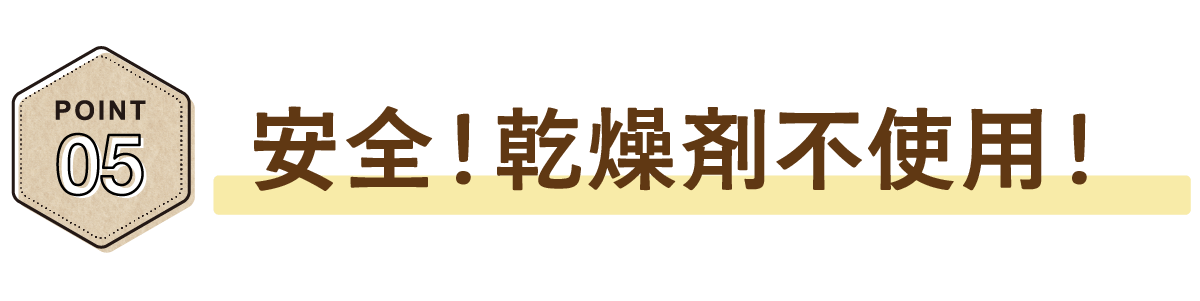 中身の保存には窒素充填方式を採用し、乾燥剤は不使用です。小さなお子様やお年寄りの方が、乾燥剤を誤って口に入れる心配もありません。