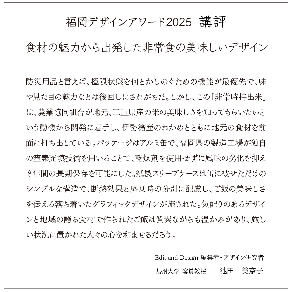 「非常時こそおいしいごはんを!」というコンセプトのもとに誕生した「非常時持出米」。さらに味のバリエーションを増やすことで、より良い商品になるのではないかと考えています。不安が続く避難生活の中、バラエティ豊かなおいしいごはんで少しでも元気づけることができればと思います。さらにその味が地元の名物料理であれば、より安心感が生まれるはずです。今後、日本各地の名物料理にも次々チャレンジしていきたいです。