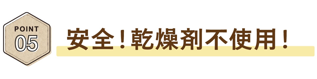 中身の保存には窒素充填方式を採用し、乾燥剤は不使用です。小さなお子様やお年寄りの方が、乾燥剤を誤って口に入れる心配もありません。