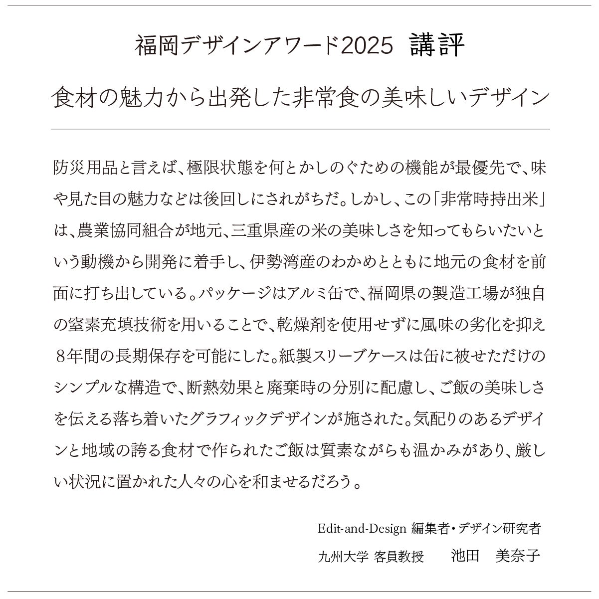 「非常時こそおいしいごはんを!」というコンセプトのもとに誕生した「非常時持出米」。さらに味のバリエーションを増やすことで、より良い商品になるのではないかと考えています。不安が続く避難生活の中、バラエティ豊かなおいしいごはんで少しでも元気づけることができればと思います。さらにその味が地元の名物料理であれば、より安心感が生まれるはずです。今後、日本各地の名物料理にも次々チャレンジしていきたいです。