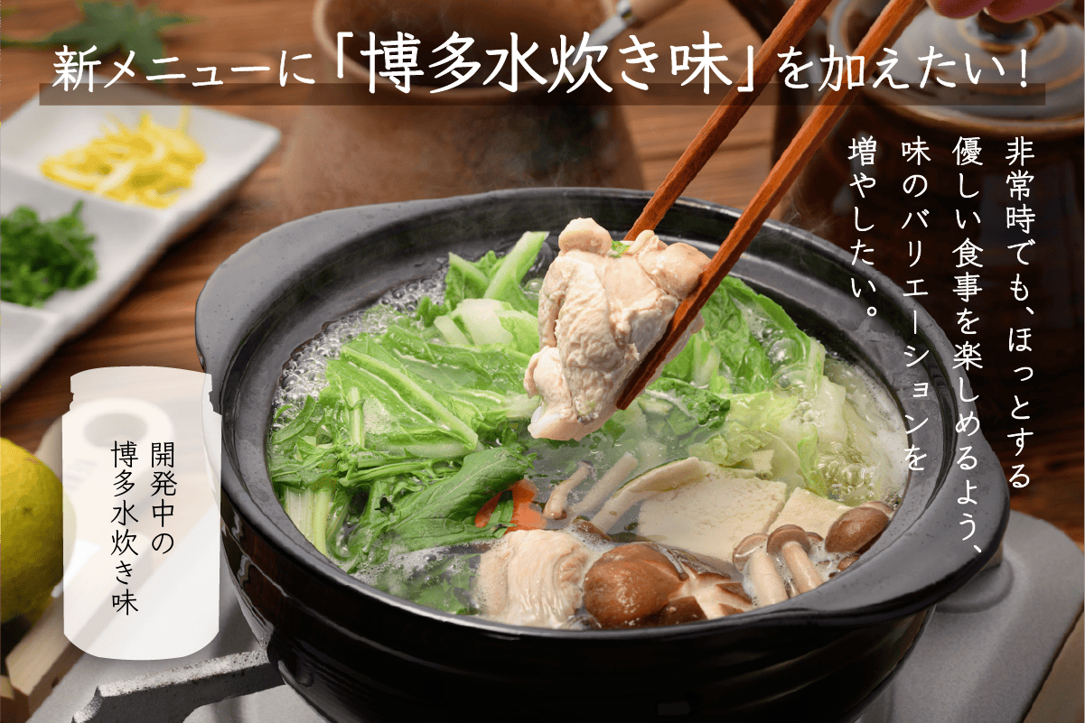 人はどんな時も食べなければ生きていけません。過酷な状況のときこそ安心して美味しいご飯を食べられるようにしたい、そんな思いから開発を続けています。本プロジェクトでは新たに福岡県の味「水炊き」を製造して、皆様のお役に立ちたいと考えていますので、ご支援をよろしくお願いいたします。