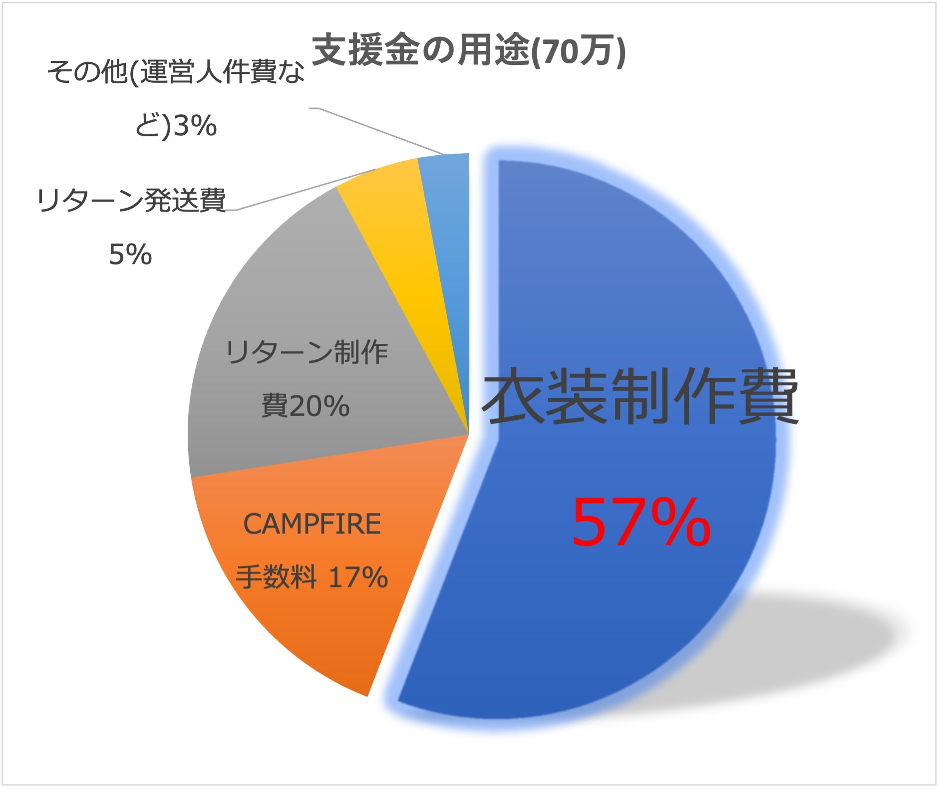 総支援金額から諸経費を除いた57%をゴール達成時に衣装の制作費(デザイン料含む)へと充てさせていただきます。