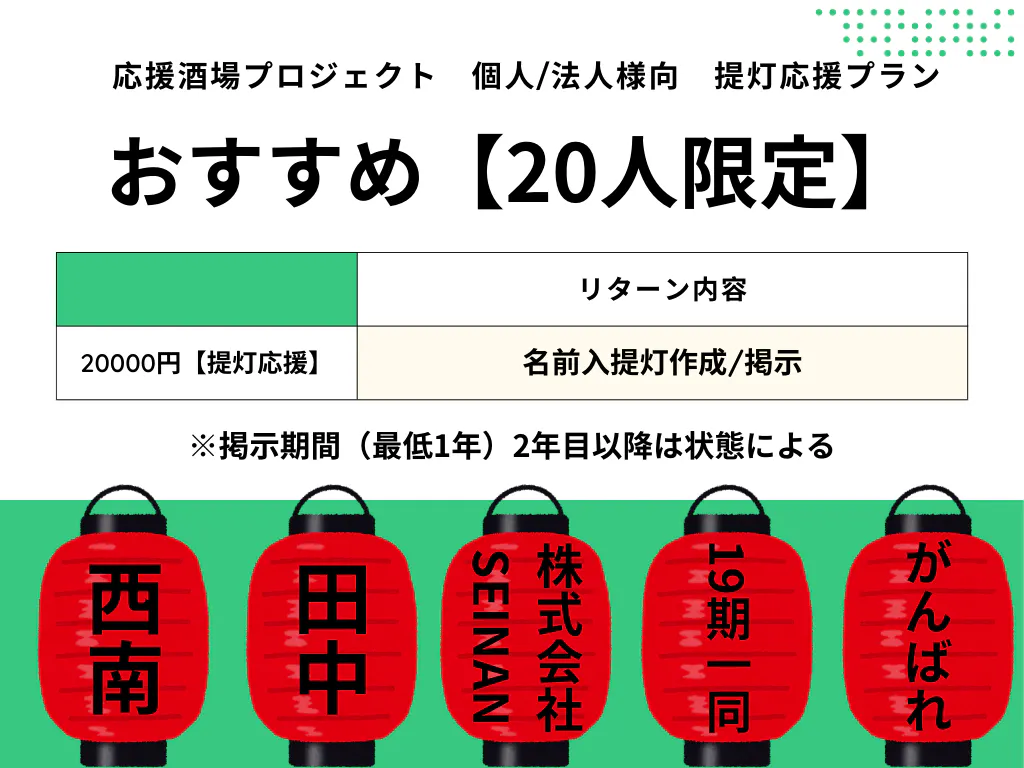 このプロジェクトは、私の夢であると同時に、地域と母校への感謝の気持ちを形にするものです。皆様からのご支援を通じて、学生たちや地域の皆様が集い、笑顔が溢れる居酒屋を実現したいと願っています。どうか私たちの挑戦に力を貸していただければ幸いです。心からの感謝を込めて、皆様のご支援をお待ちしております。ぜひ、このプロジェクトの「仲間」になってください。