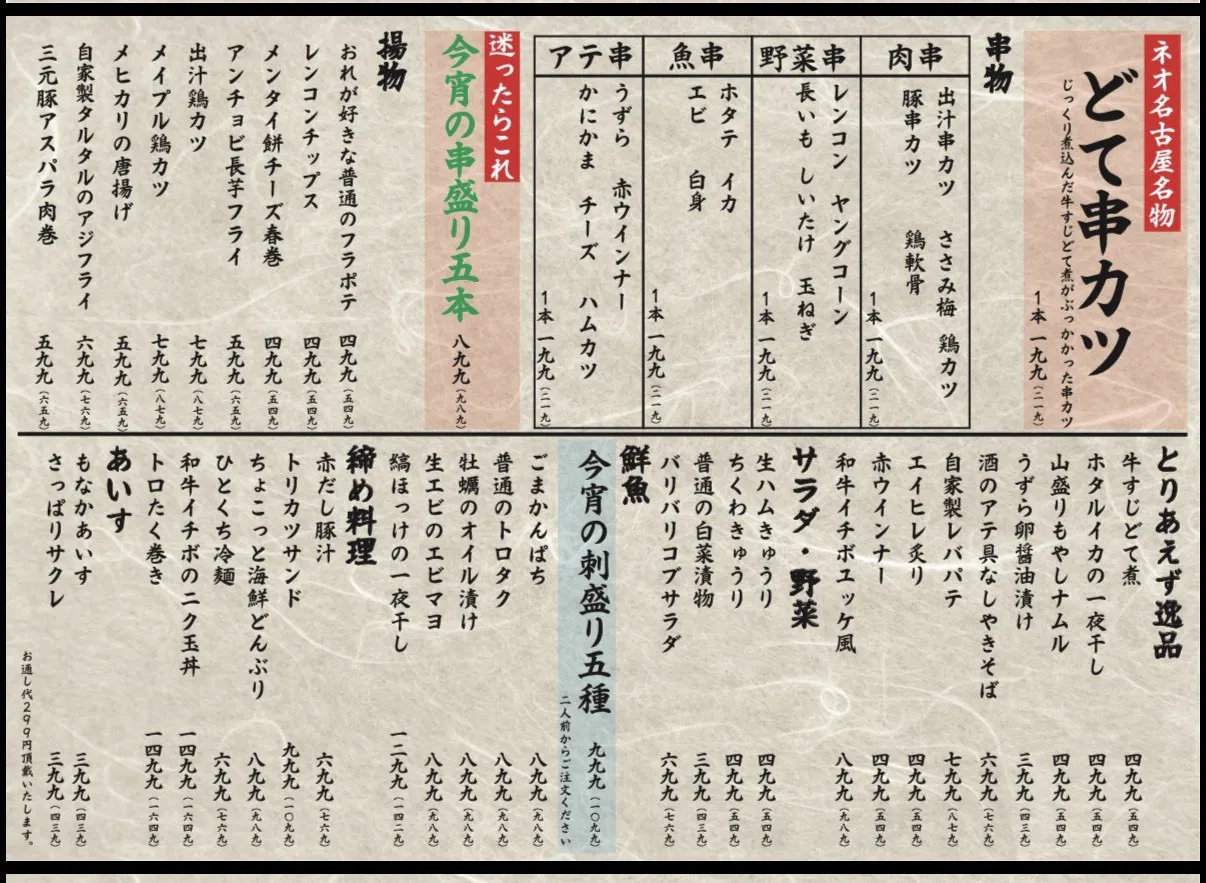 名物どて串カツと各種串揚げ 1本199円!瓶ビールは 299円 で楽しめる、元気な大衆居酒屋。