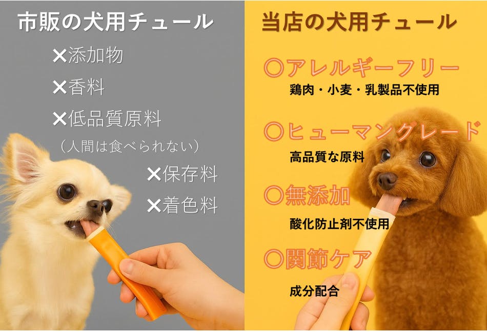 市販の犬用チュールは、香料・添加物・低品質な原材料が使われることも多く、アレルギーや涙やけ、嘔吐などで悩む子が多い現状があります。