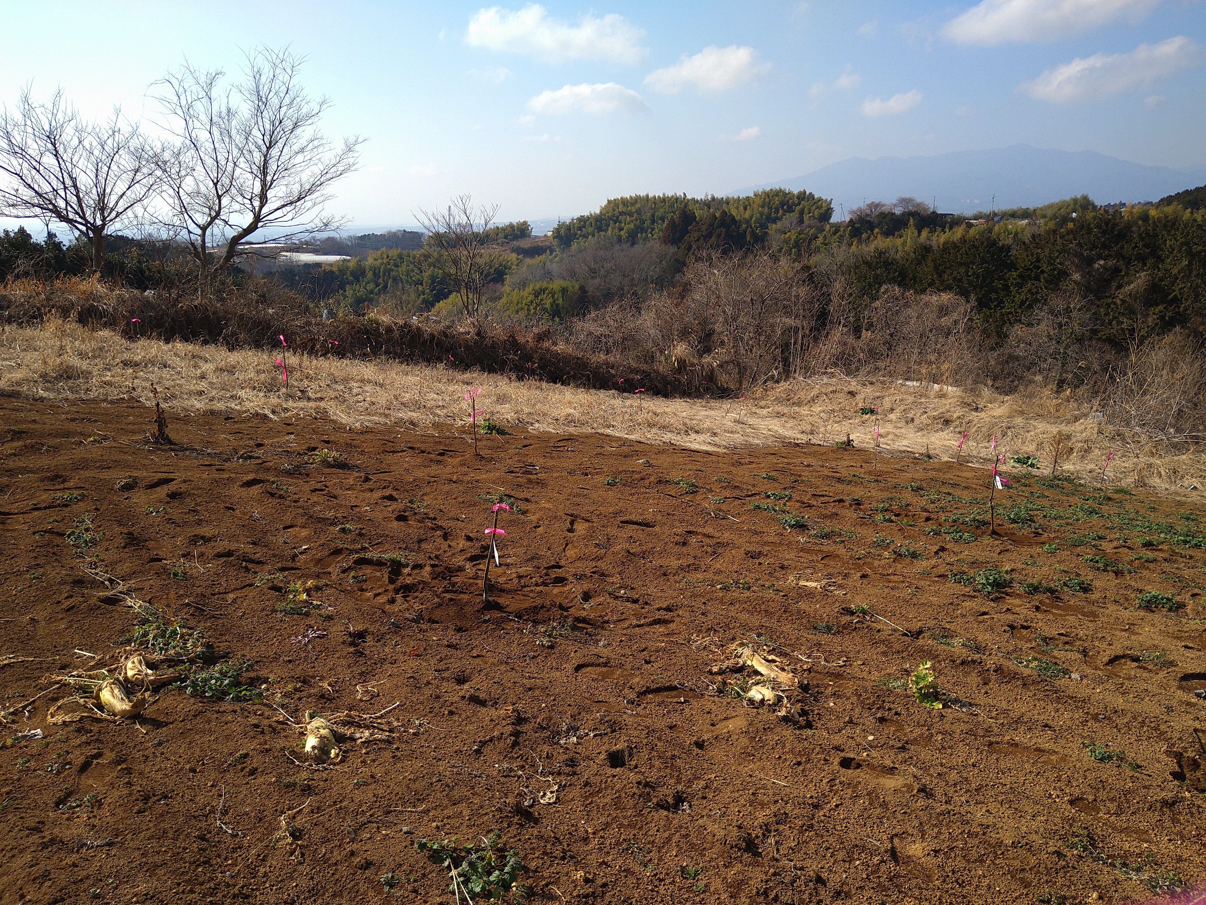 2026/02/27 17:39先日の雨で富士山真っ白です。マフラーみたいな雲がかかってますまだまだ畑は寒いです。 もっと見る44本 栗の苗増えました。しるしにピンクリボンしました
