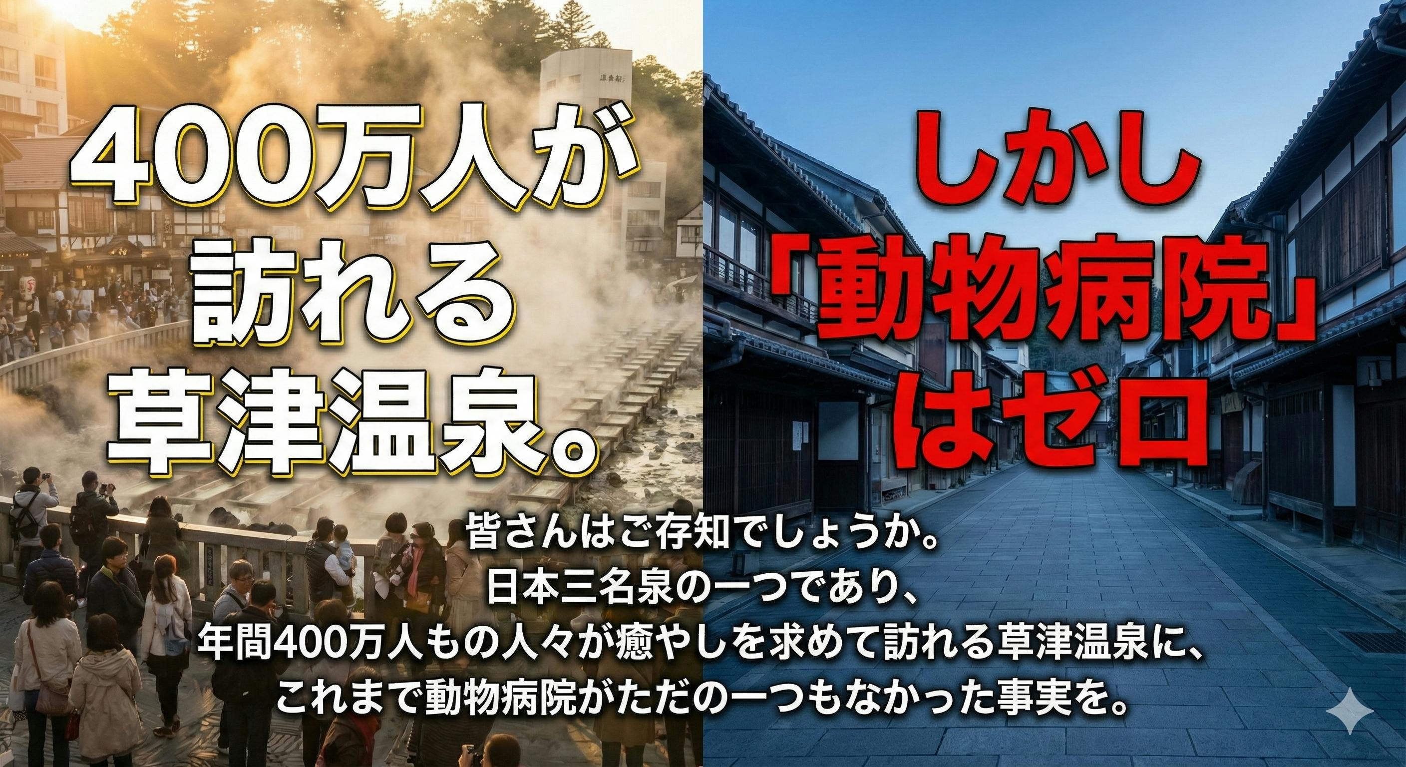 癒やしを求めて年間400万人もの人々が訪れるこの町に、動物病院が一軒もない(ゼロ)という事実をご存知でしょうか。