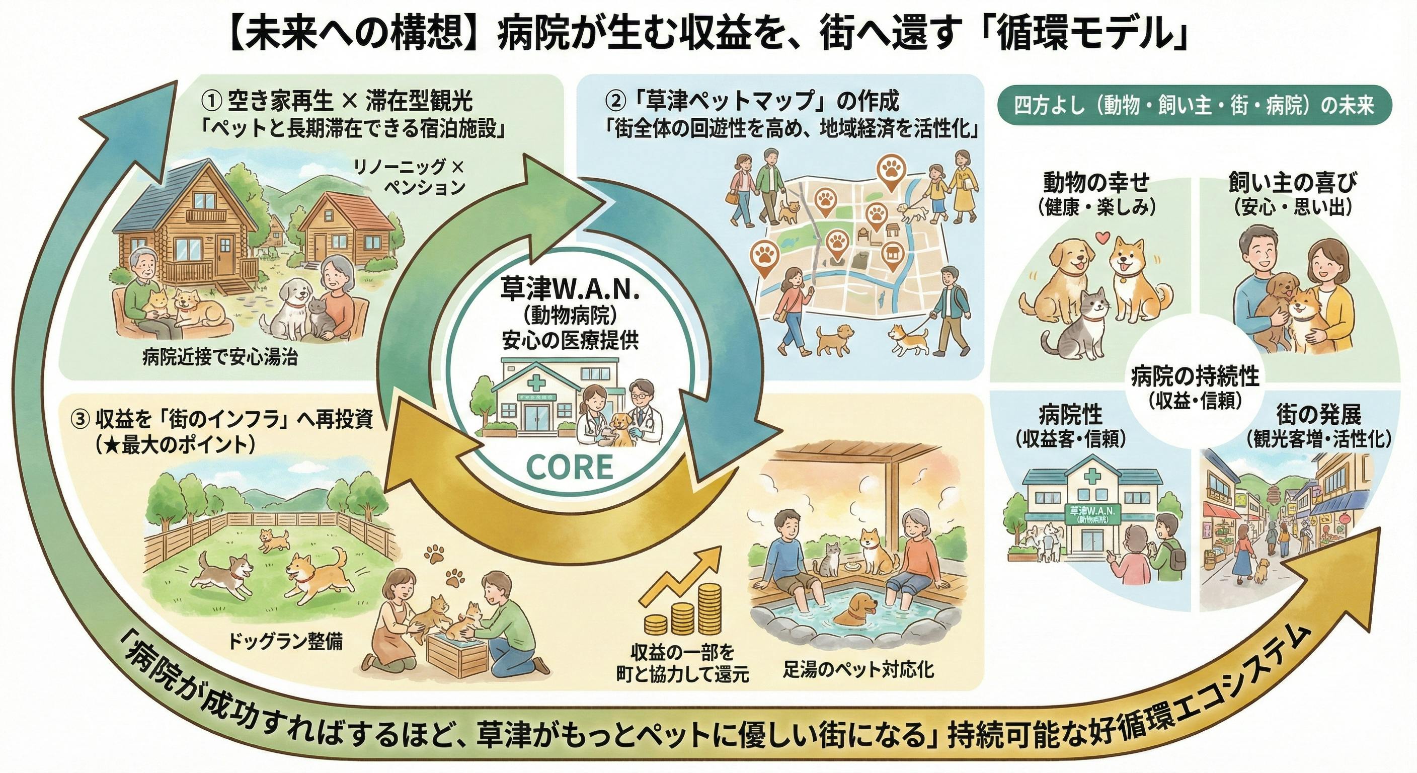 ここが最大のポイントです。 事業で得た収益の一部を町と協力して「ドッグランの整備」「足湯のペット対応化」などに充てていきます。 「病院が成功すればするほど、草津がもっとペットに優しい街になる」。そんな四方よし(動物・飼い主・街・病院)の未来を作ります。