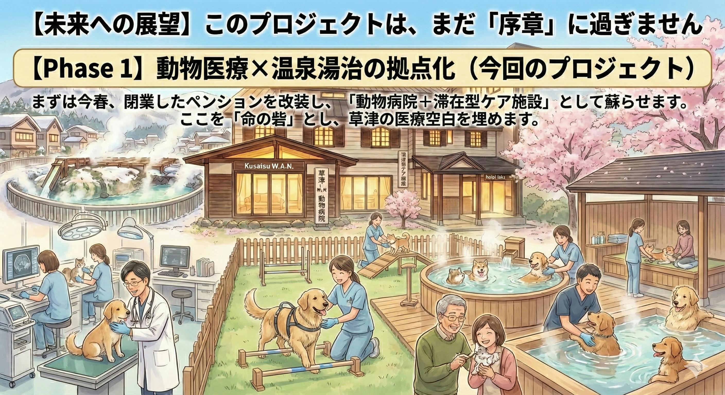 まずは今春、閉業したペンションを改装し、「動物病院+滞在型ケア施設」として蘇らせます。ここを「命の砦」とし、草津の医療空白を埋めます。