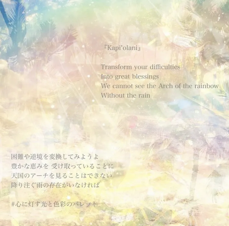 ハワイ語の諺の一つ、『‘Ole Ua, ‘Ole Anuenue』。意味は、「雨が降らなければ、虹は出ない」。画像の作品タイトルでもあり、2023年10月のハワイ・オアフ島初訪問、最終日サンセット×プルメリアの木に誕生した【心の光景・記憶】。