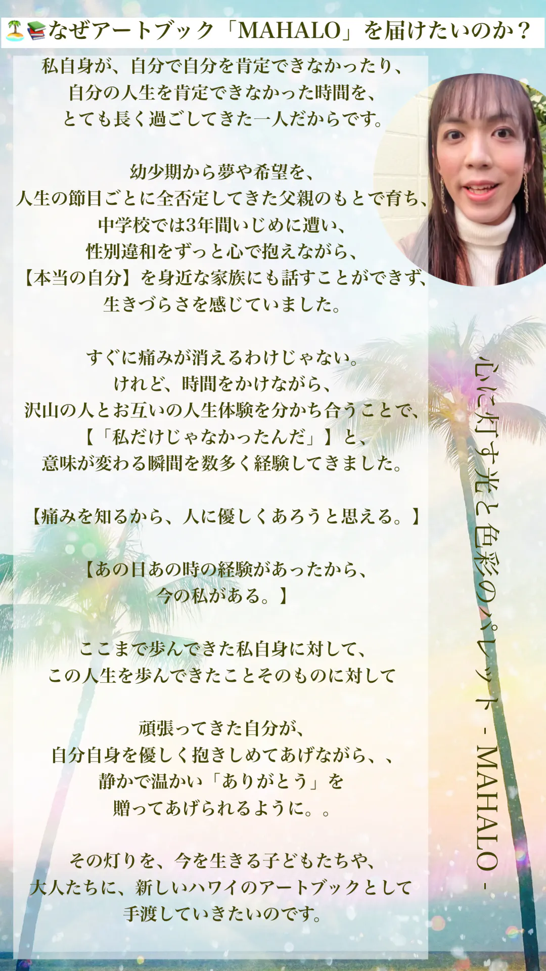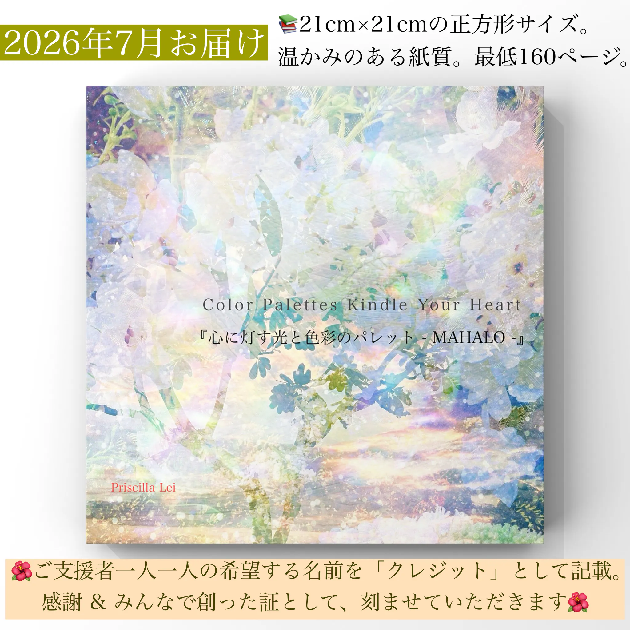 今回のプロジェクトは、2023年〜2025年の 3年間にわたって3度訪問、“ハワイ滞在創作(オアフ島・マウイ島・ハワイ島)”の挑戦を通して誕生した「MAHALOシリーズ」のフォトアート&メッセージ 全78作品 を集約。アートブック『心に灯す光と色彩のパレット - MAHALO - 』の出版実現に向けたものです。