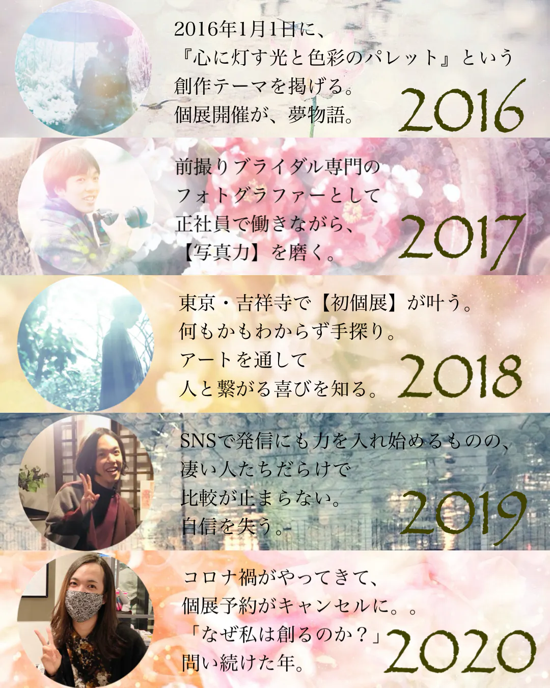 私は10年間ずっと「心に灯す光と色彩のパレット」という創作テーマを掲げ、“自分で自分を癒し、勇気づけながら一人一人が「私らしさ」を取り戻せるような心の拠り所” を、アート作品や紡ぐメッセージを通して届けてきました。