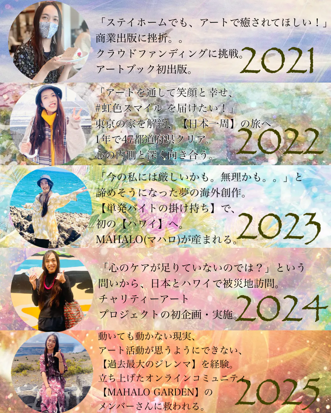 純度と想いを込めた作品のお迎え、全国各地で開催した個展は18回、クラウドファンディングの挑戦は今回で7回目、過去にアートブック2冊出版、オリジナルオラクルカードのリリース、日本一周しながら滞在創作も達成、ハワイでの滞在創作も3年連続で達成。