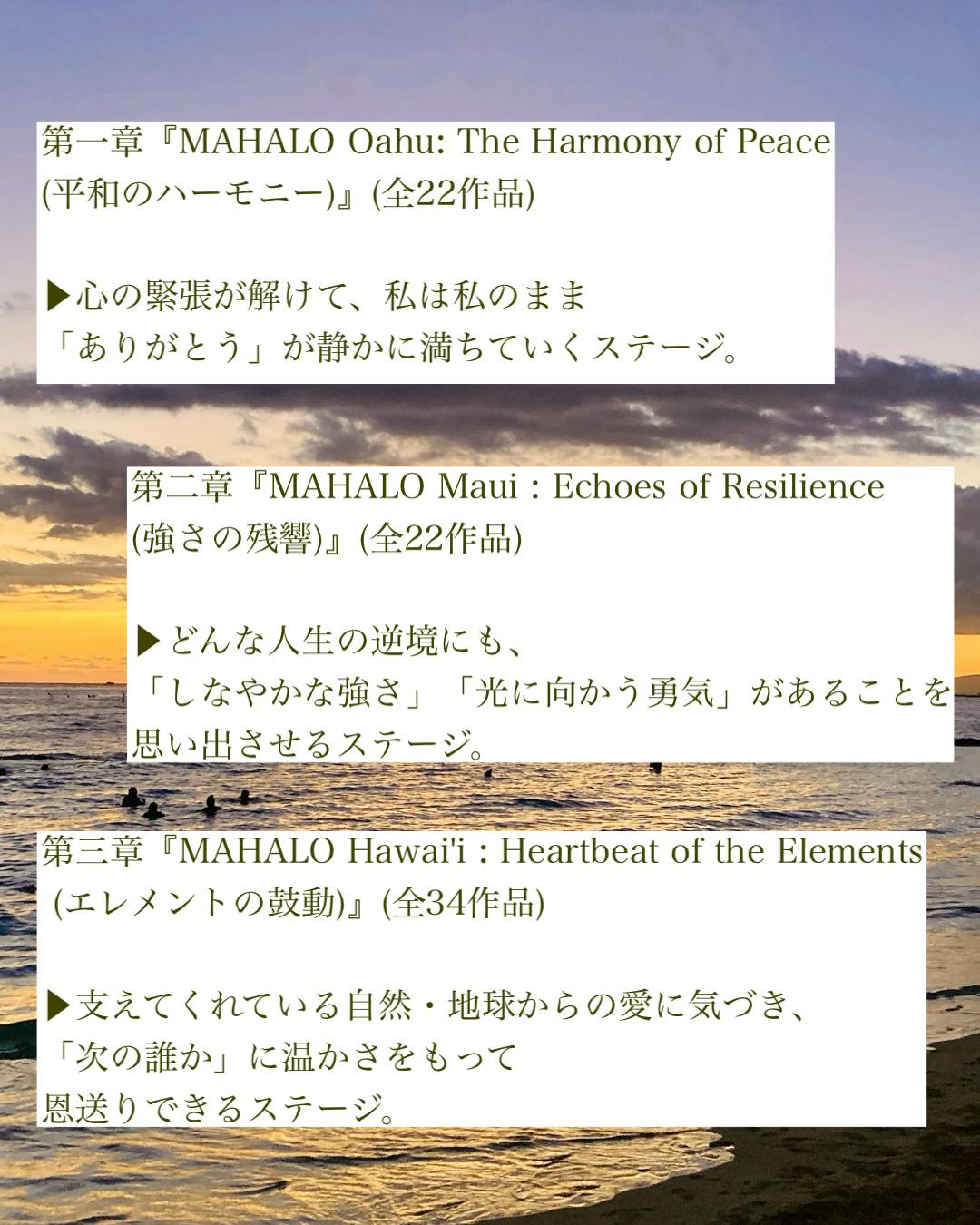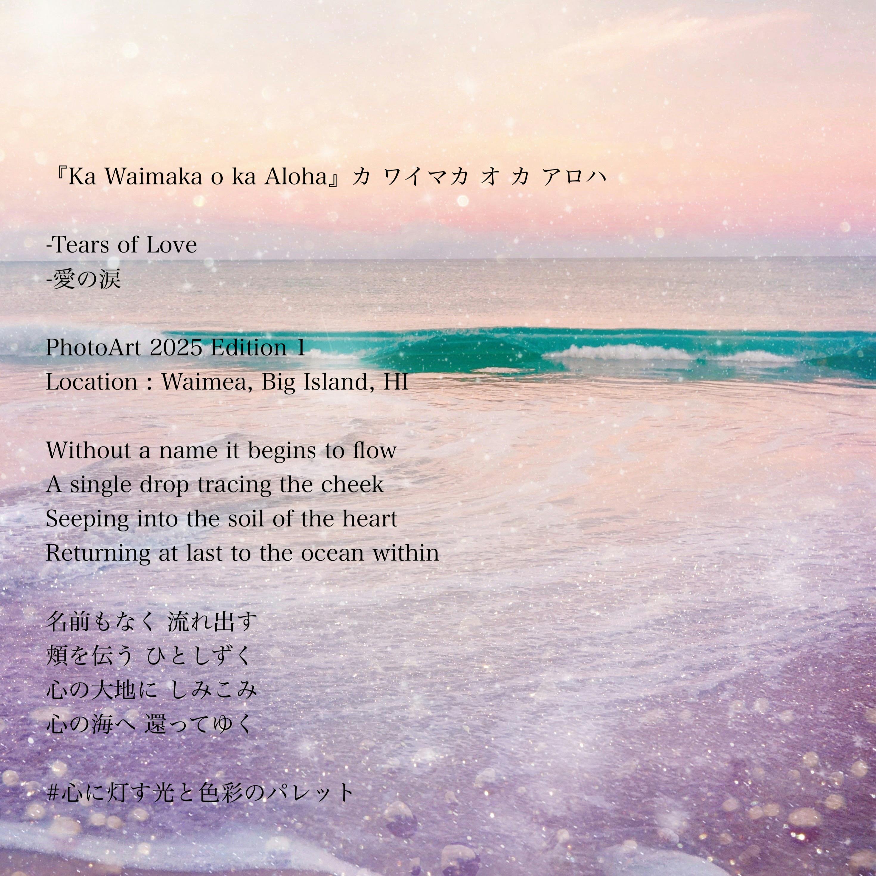 今回のプロジェクトは、2023年〜2025年の 3年間にわたって3度訪問、“ハワイ滞在創作(オアフ島・マウイ島・ハワイ島)”の挑戦を通して誕生した「MAHALOシリーズ」のフォトアート&メッセージ 全78作品 を集約。アートブック『心に灯す光と色彩のパレット - MAHALO - 』の出版実現に向けたものです。