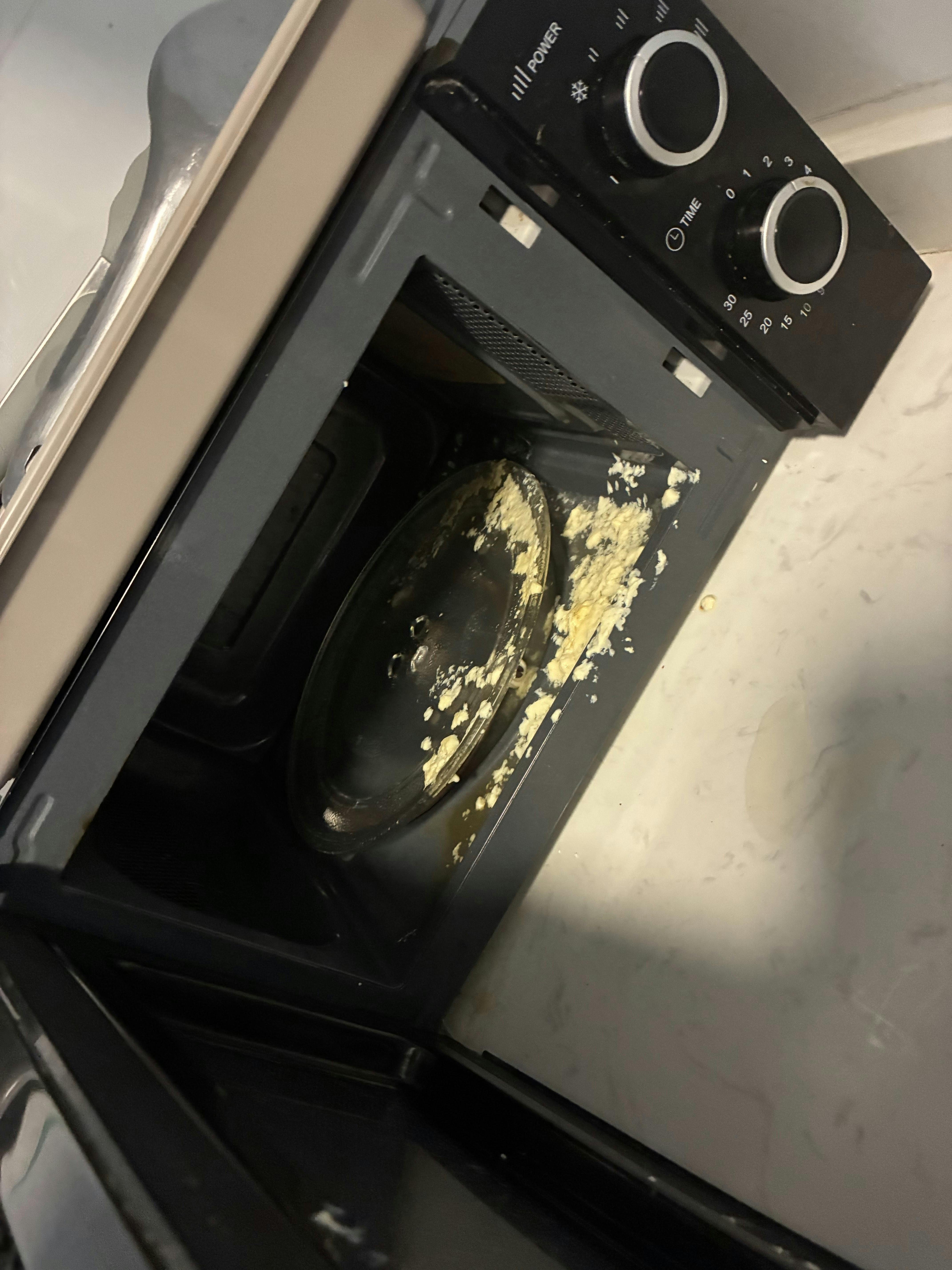 (アパート到着後に茶碗蒸しを作ろうとして電子レンジ内で爆発した様子・・・)