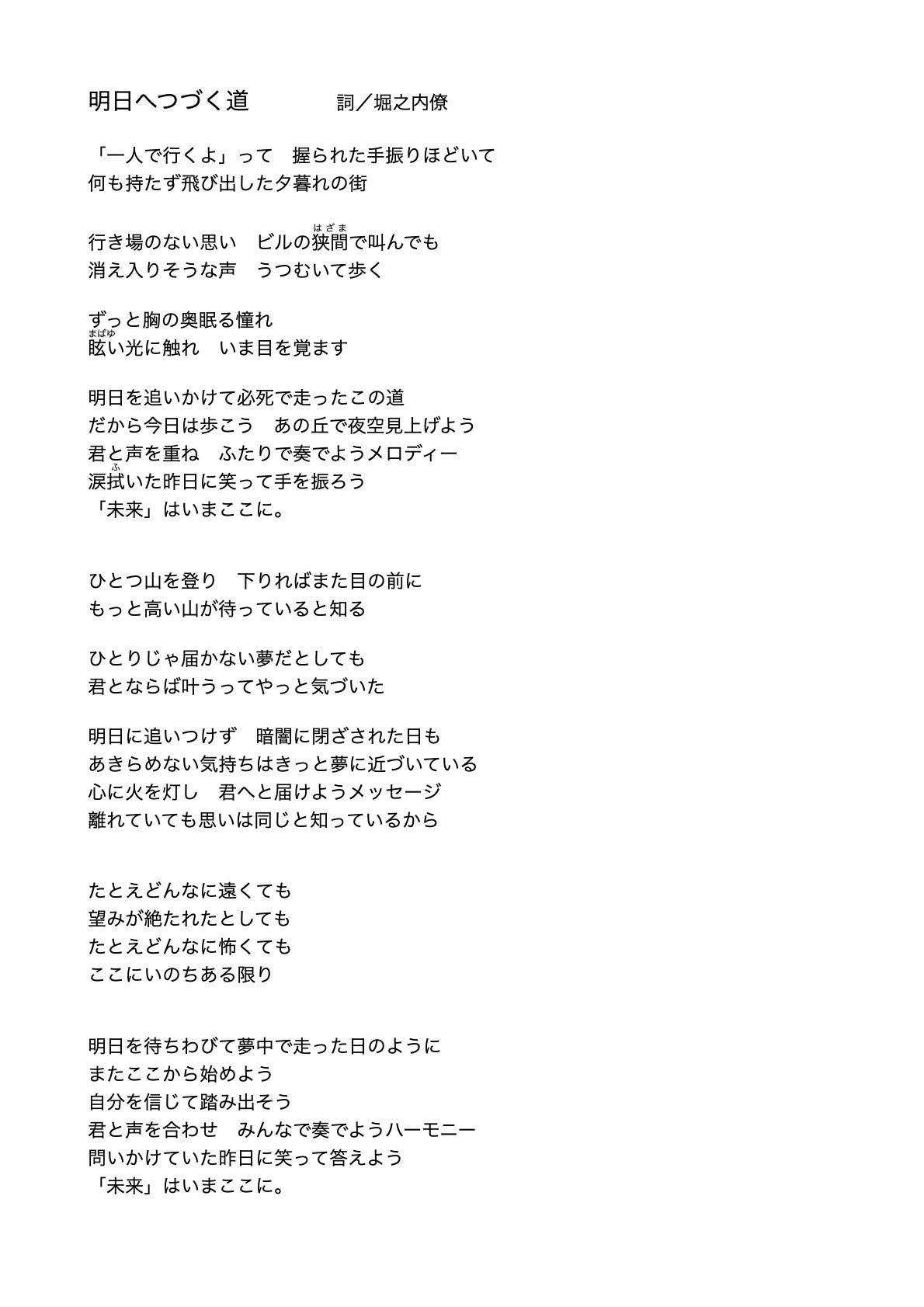 この曲を作った当時の僕は、創作活動を行うために、また自分自身と向き合うために殻に閉じこもり、身近な人たちが差し伸べてくれる手も取れずにいました。しかしそんな精神状態でも、心の底では誰かと心を通わせ、ともに歌うことを望んでいる自分がいました。そんな「今の自分」と、ずっと変わらずに胸の中にある憧れや理想を描いたのがこの『明日へつづく道』という楽曲です。