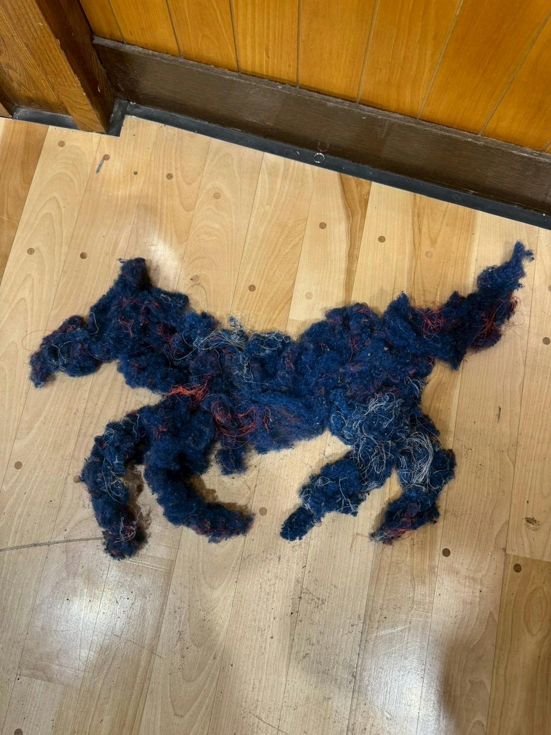 掃除といっても、ただの作業をするだけではありません。マジックテープの部分から、ゴミやカスを取り除く作業はなかなかハードで地道な作業ですが、集まったゴミやカスでハートの形を作ってみたり、クリスマス前にはツリー、新年には馬のシルエットを作ってみたりと、ちょっとした遊び心も忘れません。